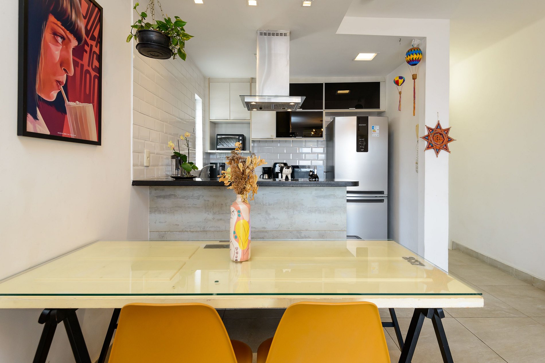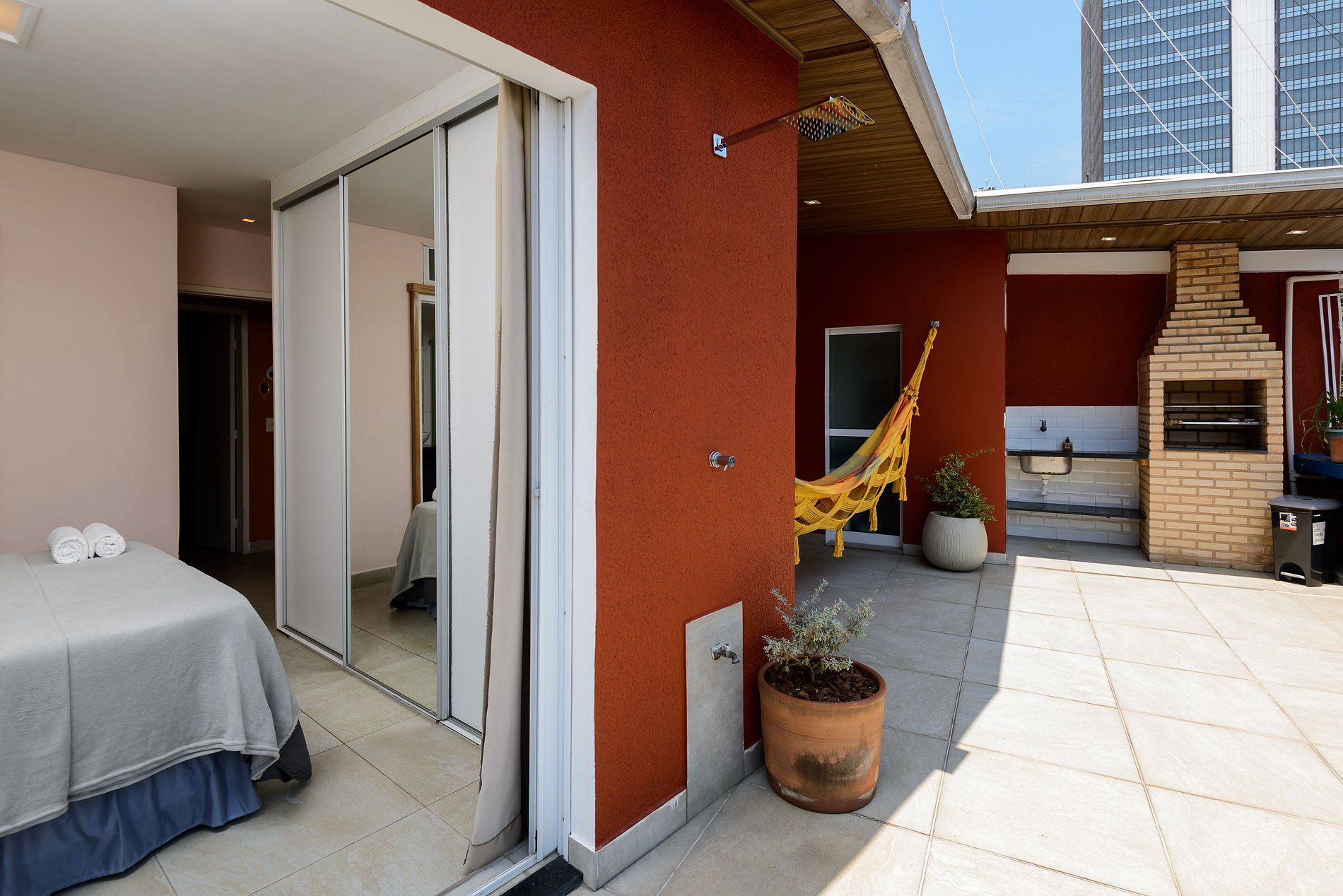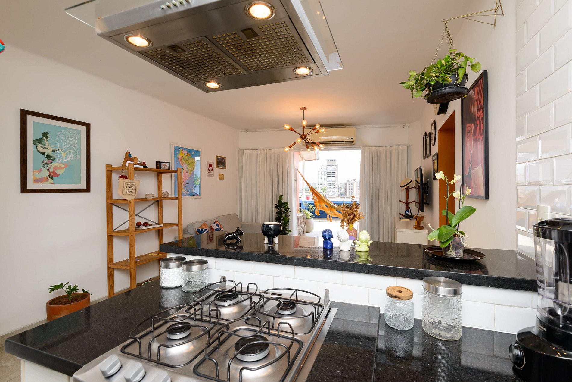 A suíte é integrada com o terraço, possui cama Queen-Size, ar-condicionado split e banheiro privativo. O segundo quarto é ideal para trabalho ou descanso: conta com uma bi-cama de solteiro, workstation e ar-condicionado split. Ambos os quartos possuem armário. A sala de estar é integrada com a cozinha e terraço e dispõe Smart TV, garantindo praticidade e lazer.