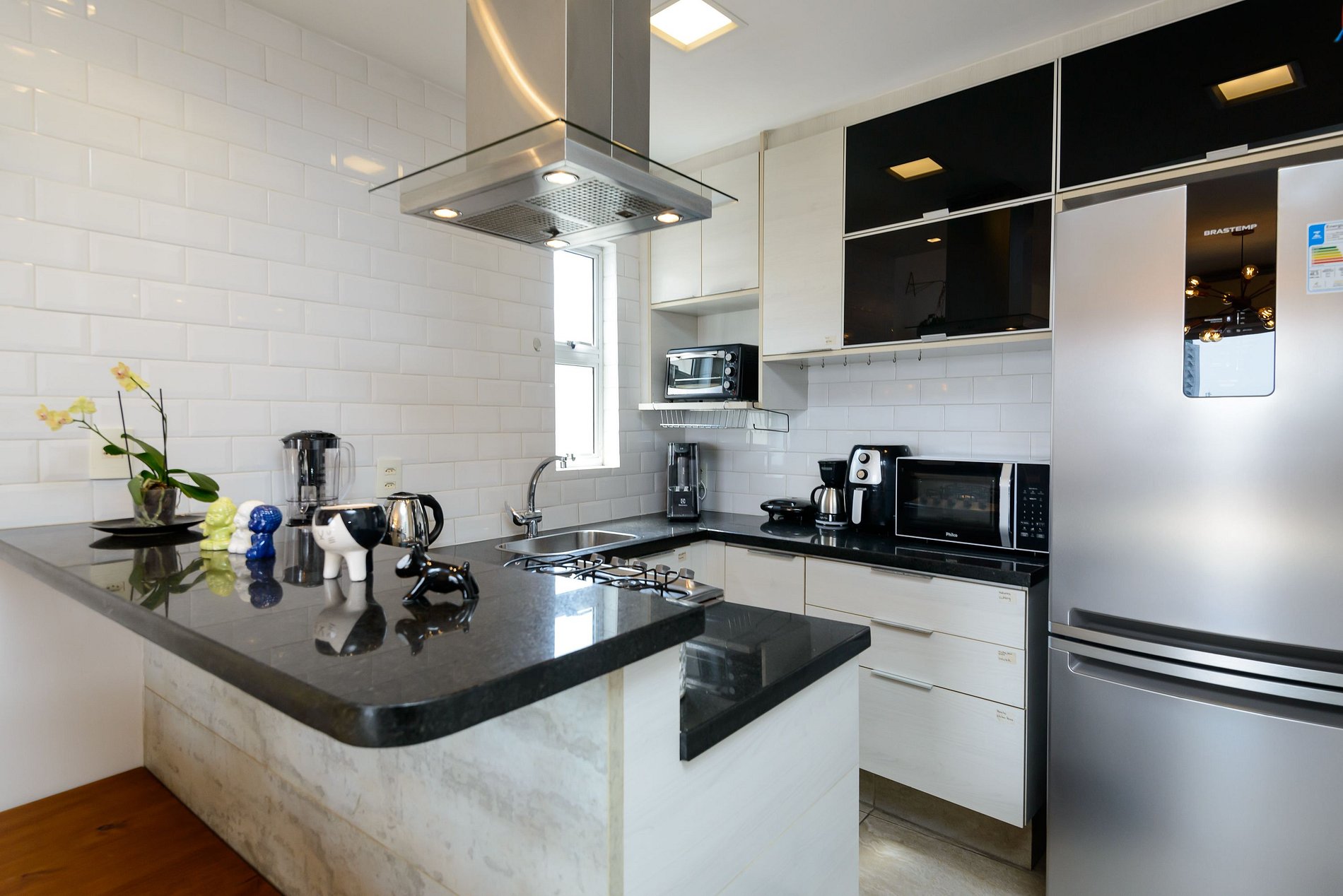 A cozinha está completa: com micro-ondas, fogão e forno a gás, geladeira, filtro de água, máquina de café, liquidificador, pratos, copos, talheres, panelas e muitos outros itens. Os banheiros possuem box de vidro, chuveiro com água quente e secador de cabelo.