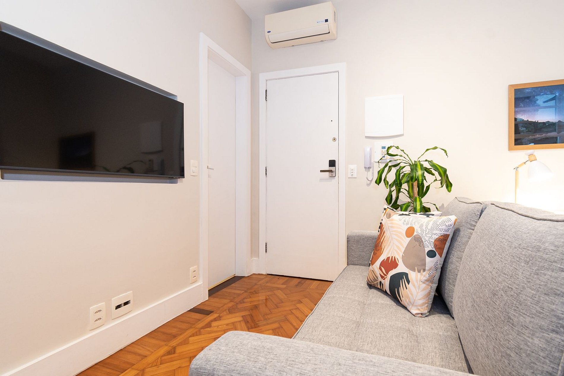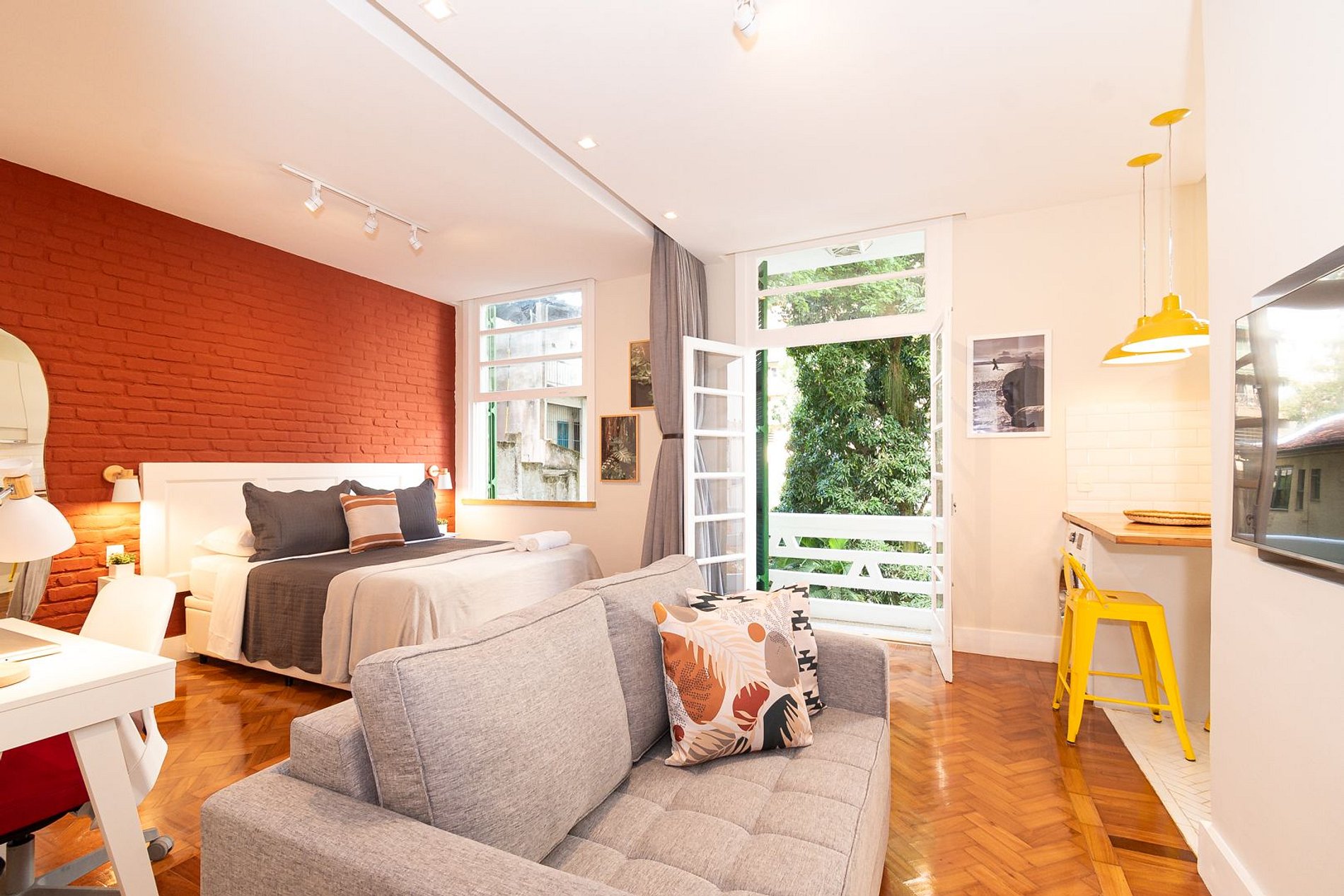 Estúdio dedicado à hospitalidade, equipado com todas as facilidades para uma estadia confortável e agradável. O quarto está equipado com uma cama Queen-Size, ar-condicionado split e estação de trabalho. A sala de estar possui ar-condicionado split, SmartTV e sofá-cama. A cozinha está totalmente equipada com tudo que você precisa para se sentir em casa: micro-ondas, fogão a gás de quatro bocas, forno elétrico, frigobar, máquina de café, liquidificador, pratos, panelas e talheres. O banheiro tem box com chuveiro e secador de cabelo.
