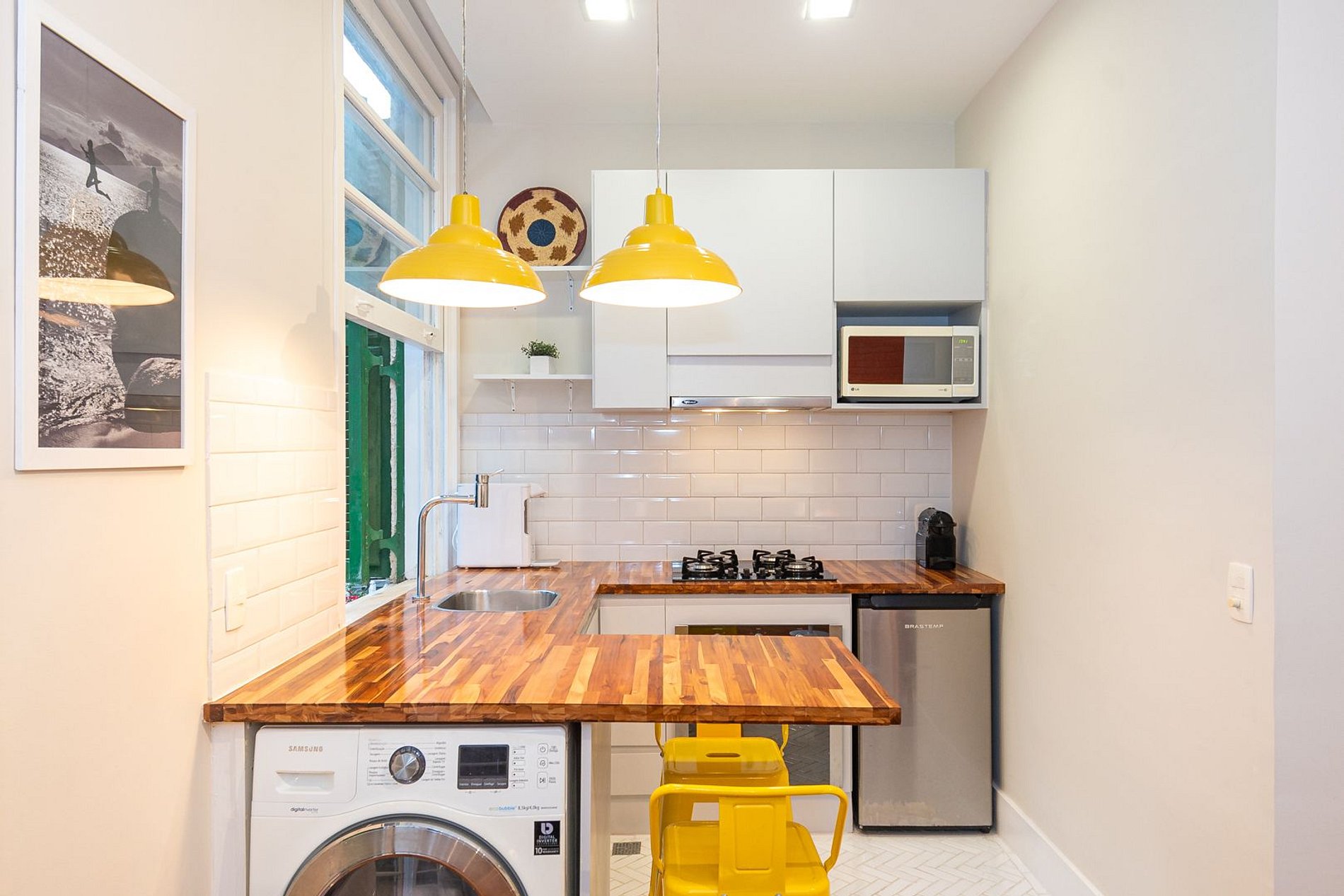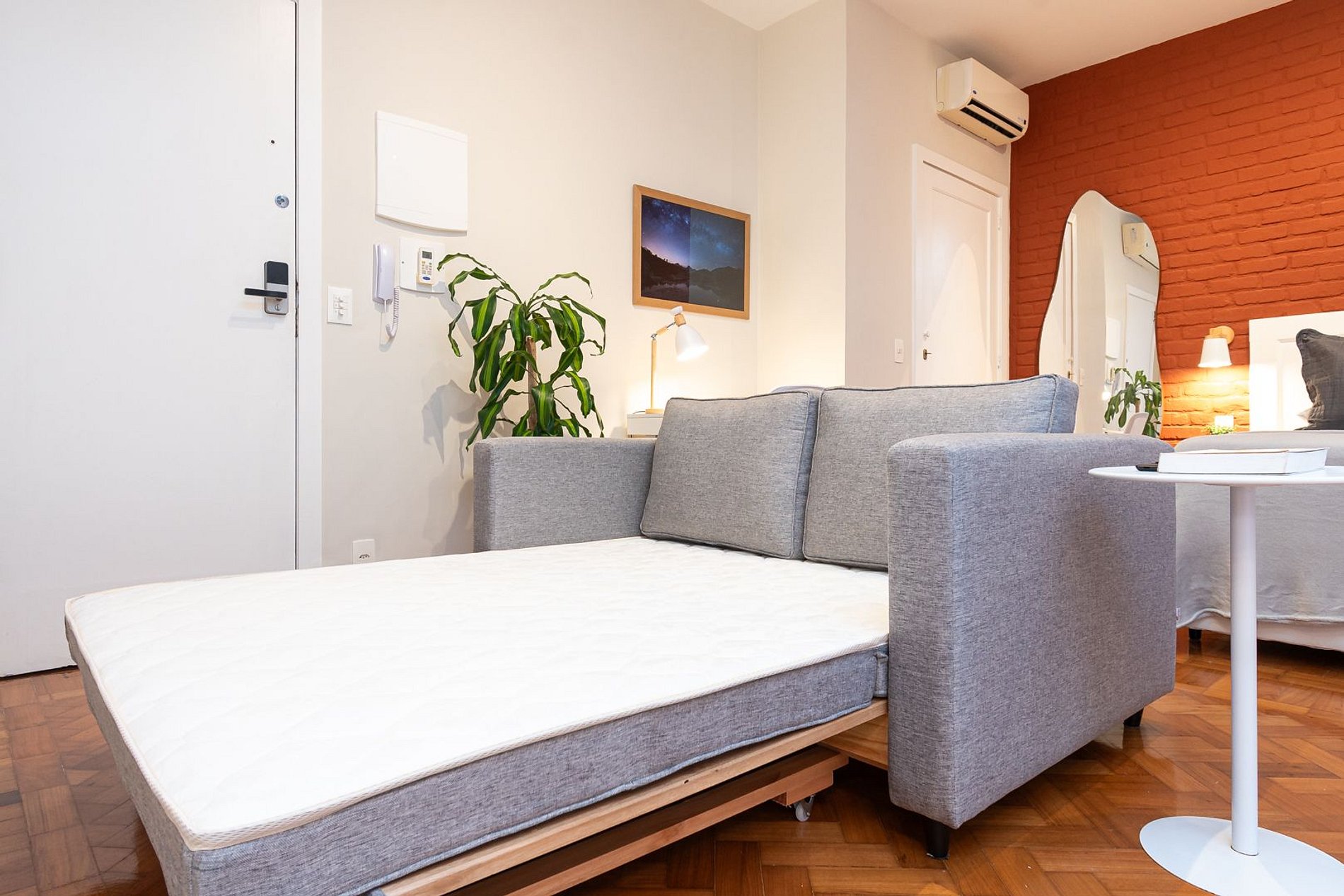 Estúdio dedicado à hospitalidade, equipado com todas as facilidades para uma estadia confortável e agradável. O quarto está equipado com uma cama Queen-Size, ar-condicionado split e estação de trabalho. A sala de estar possui ar-condicionado split, SmartTV e sofá-cama. A cozinha está totalmente equipada com tudo que você precisa para se sentir em casa: micro-ondas, fogão a gás de quatro bocas, forno elétrico, frigobar, máquina de café, liquidificador, pratos, panelas e talheres. O banheiro tem box com chuveiro e secador de cabelo.