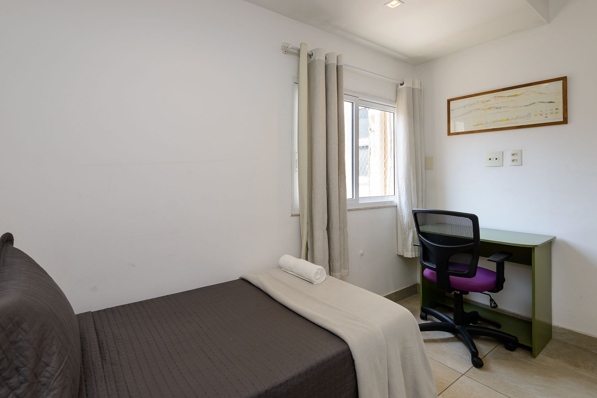 A suíte é integrada com o terraço, possui cama Queen-Size, ar-condicionado split e banheiro privativo. O segundo quarto é ideal para trabalho ou descanso: conta com uma bi-cama de solteiro, workstation e ar-condicionado split. Ambos os quartos possuem armário. A sala de estar é integrada com a cozinha e terraço e dispõe Smart TV, garantindo praticidade e lazer.