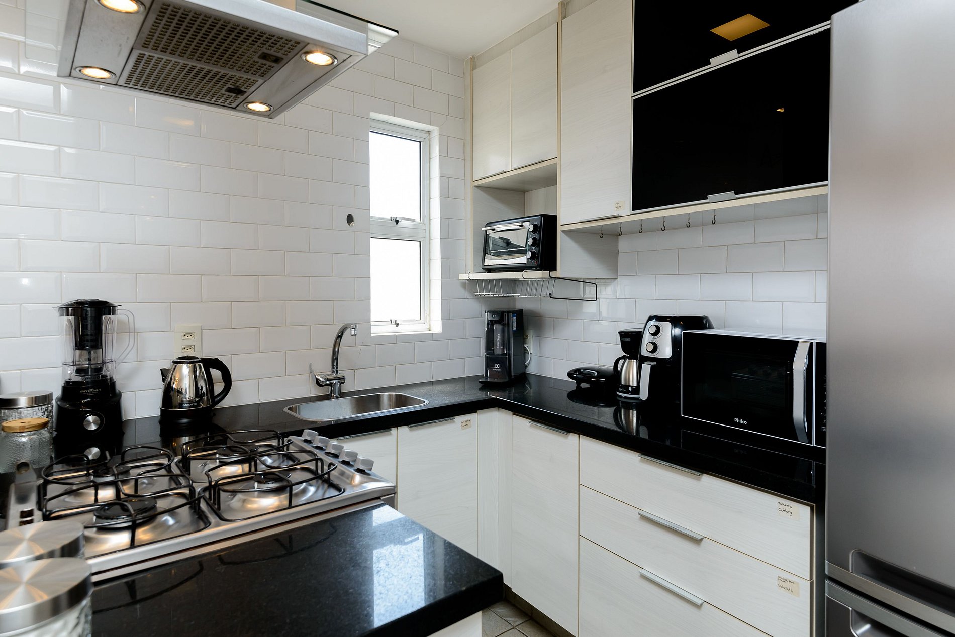 A cozinha está completa: com micro-ondas, fogão e forno a gás, geladeira, filtro de água, máquina de café, liquidificador, pratos, copos, talheres, panelas e muitos outros itens. Os banheiros possuem box de vidro, chuveiro com água quente e secador de cabelo.
