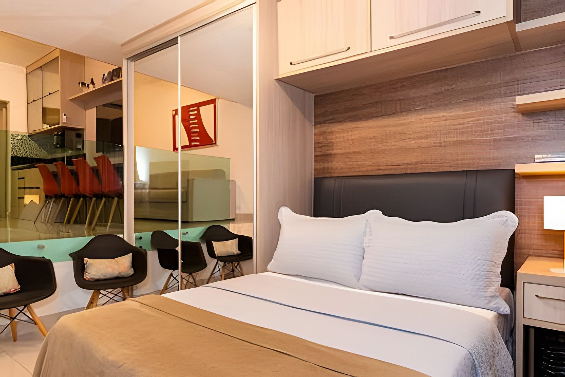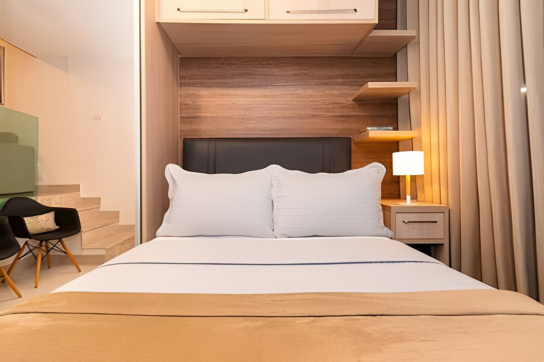 Espaço dedicado à hospitalidade, completo com todas as facilidades para uma hospedagem confortável e agradável. O quarto está equipado com uma cama de casal e SmartTv. A sala possui um sofá-cama para até 2 pessoas, SmartTv e ar-condicionado split. A cozinha está completamente equipada com tudo que você precisa para sentir-se em casa; microondas, filtro de água, frigobar, sanduicheira, máquina Nespresso, pratos, panelas, talheres. O banheiro possui box com blindex, chuveiro elétrico e secador de cabelo. Possui portaria 24 horas e garagem para 01 carro. O apartamento fica no primeiro andar e é extremamente silencioso. Para acessar o apartamento, é preciso subir um lance de escadas.