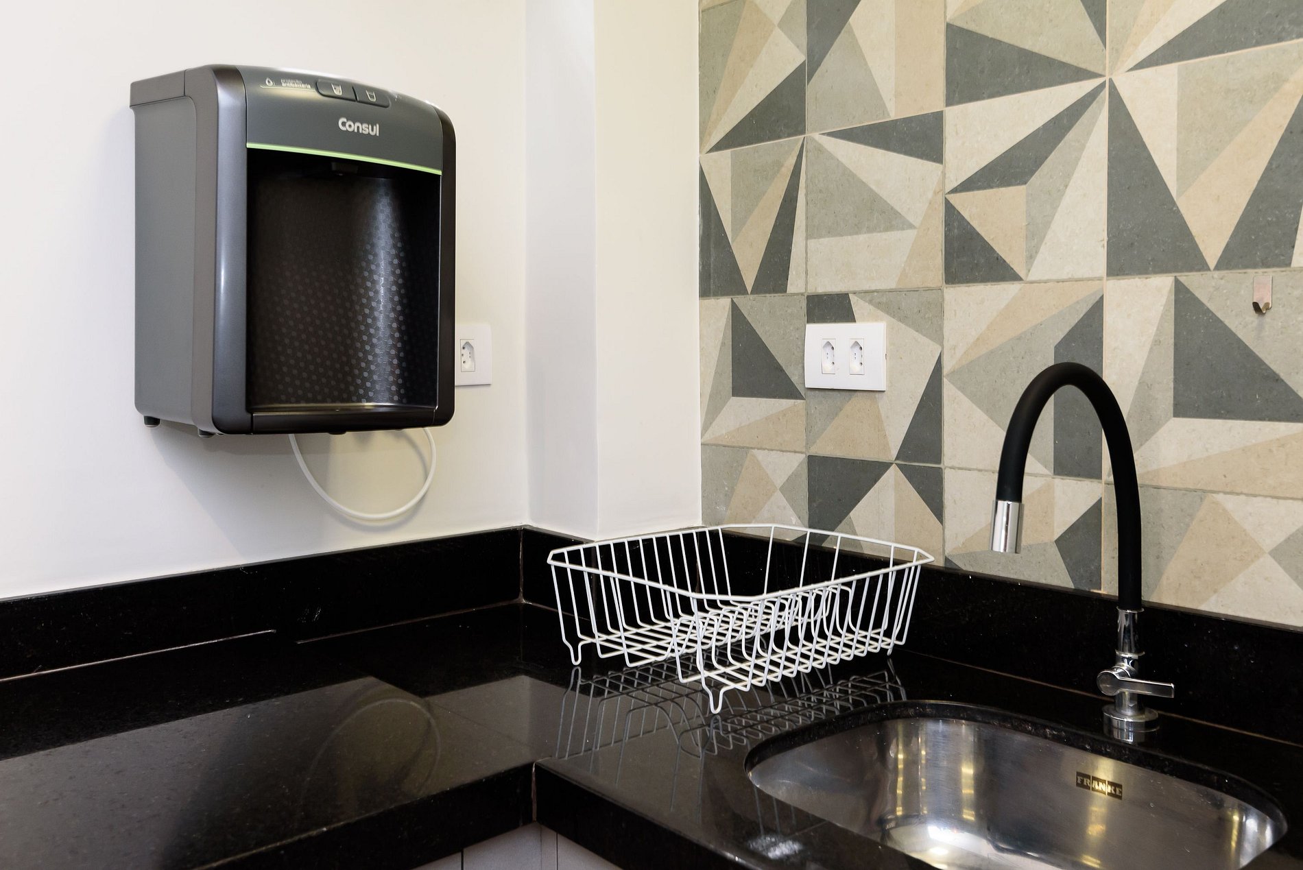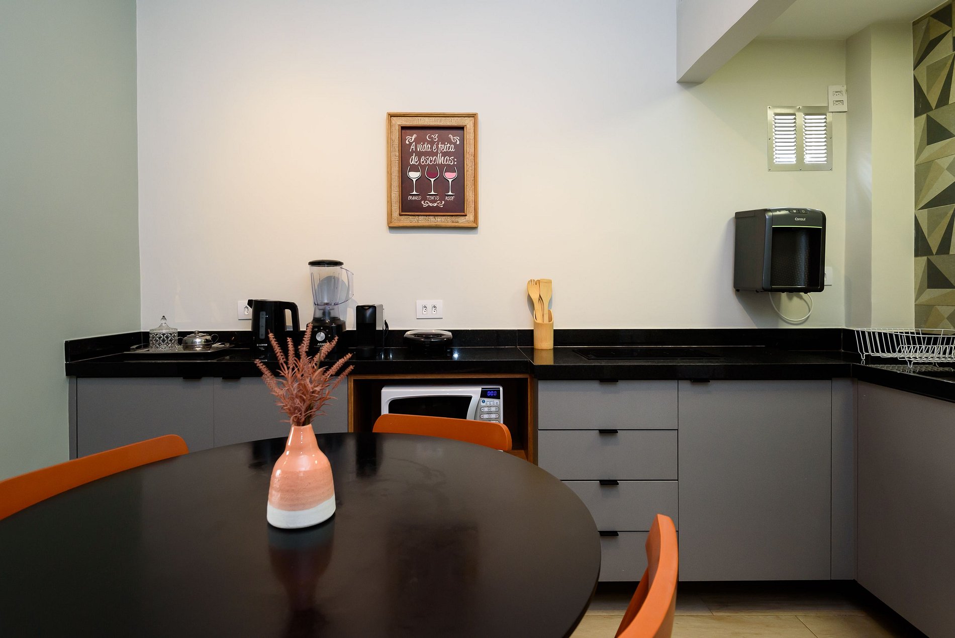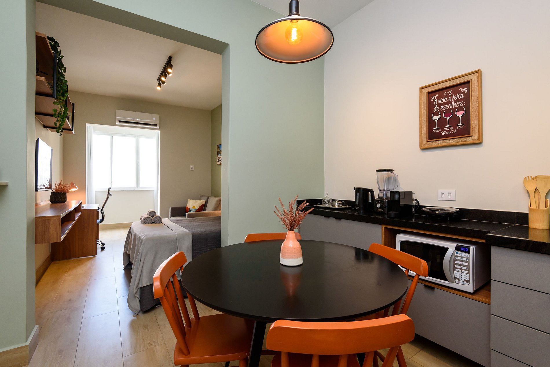 Estúdio dedicado à hospitalidade, equipado com todas as facilidades para uma estadia confortável e agradável. O quarto está equipado com uma cama casal, ar-condicionado split e estação de trabalho, SmartTV e sofá-cama. A cozinha está totalmente equipada com tudo que você precisa para se sentir em casa: micro-ondas, fogão elétrico de 2 bocas, geladeira, máquina de café Nespresso, liquidificador, pratos, panelas e talheres. O banheiro tem box com chuveiro elétrico e secador de cabelo.