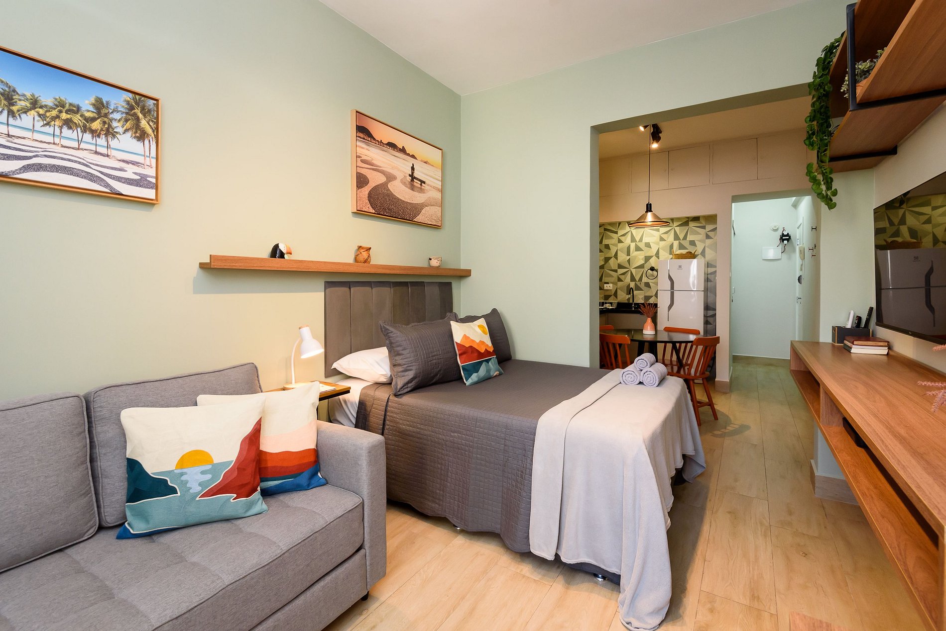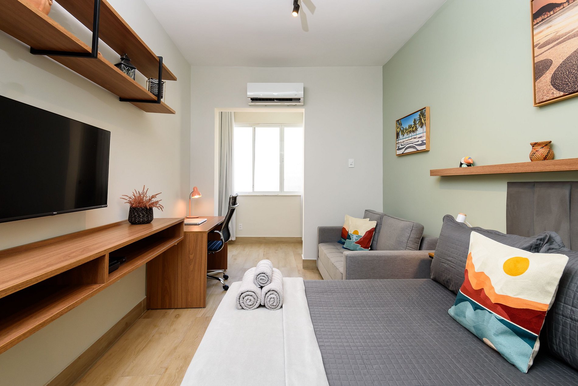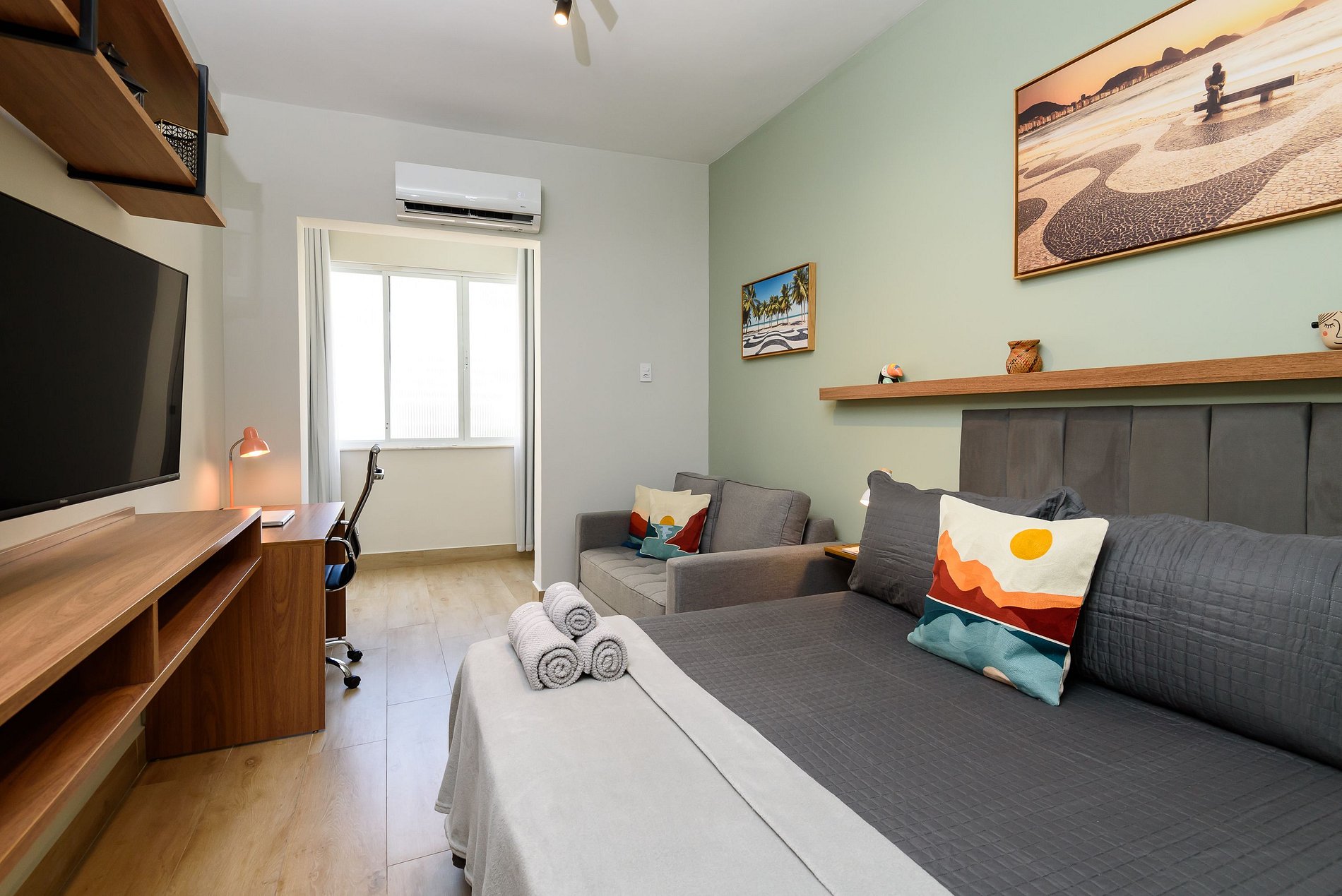 Este apartamento é equipado com Ar-Condicionado, Workstation, Wi-Fi 300 Mega, cama de casal e é perfeito pra você que busca passar alguns dias na Cidade Maravilhosa ou morar alguns meses como um verdadeiro Carioca. Localizado no melhor ponto de Copacabana e a apenas 5 minutos da praia mais famosa do mundo, este espaço acomoda até 4 pessoas e vai conquistar seu coração.