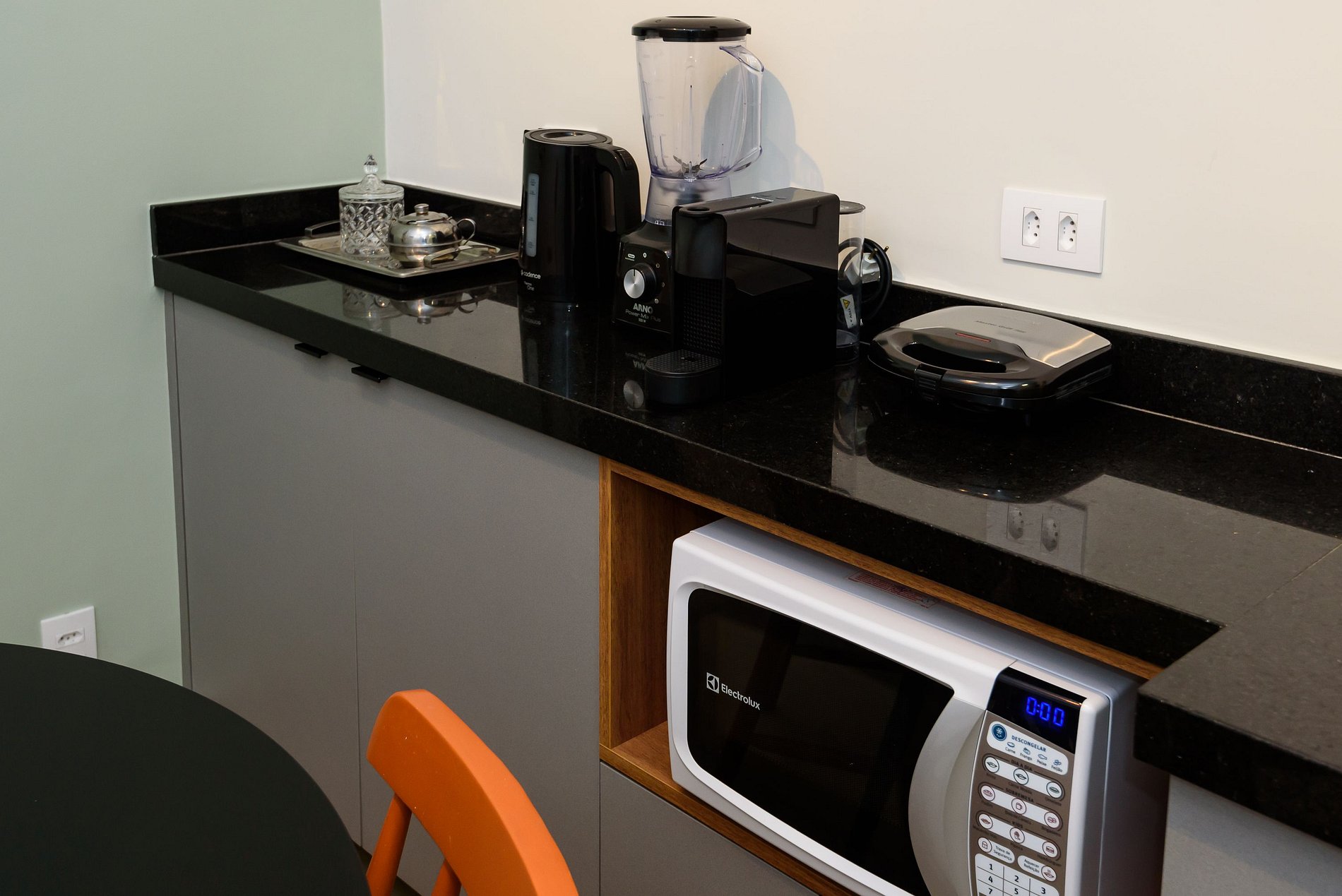 Estúdio dedicado à hospitalidade, equipado com todas as facilidades para uma estadia confortável e agradável. O quarto está equipado com uma cama casal, ar-condicionado split e estação de trabalho, SmartTV e sofá-cama. A cozinha está totalmente equipada com tudo que você precisa para se sentir em casa: micro-ondas, fogão elétrico de 2 bocas, geladeira, máquina de café Nespresso, liquidificador, pratos, panelas e talheres. O banheiro tem box com chuveiro elétrico e secador de cabelo.
