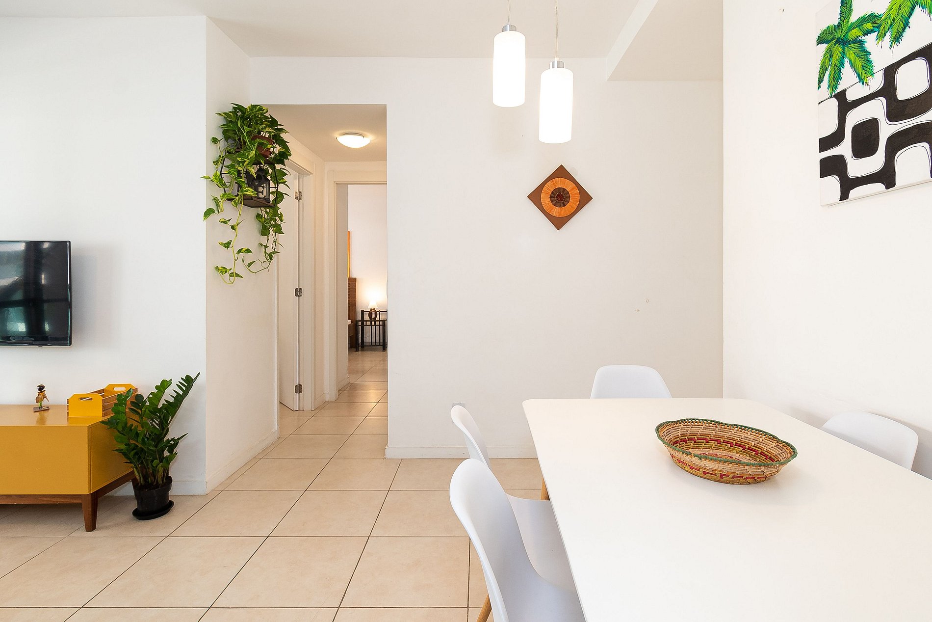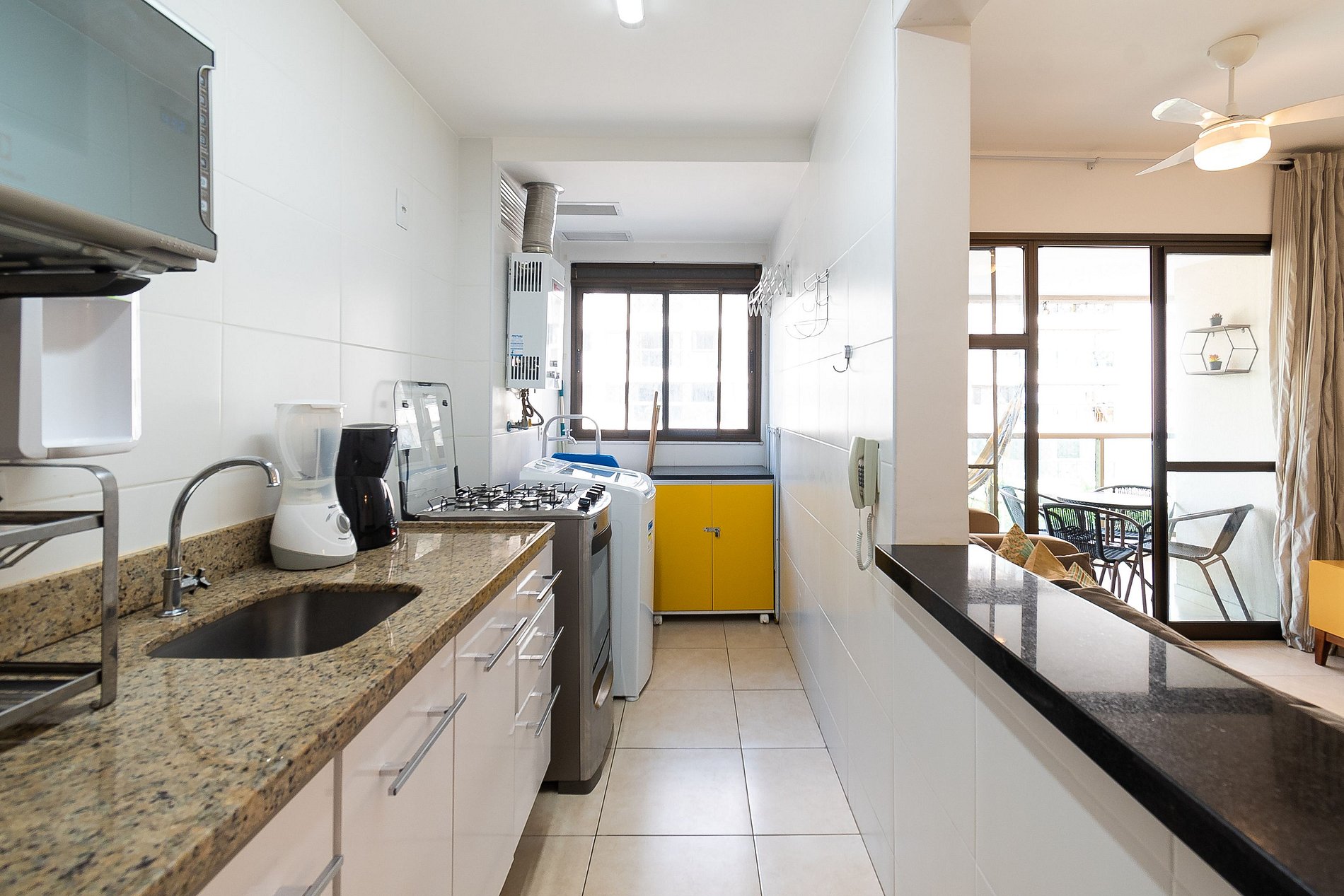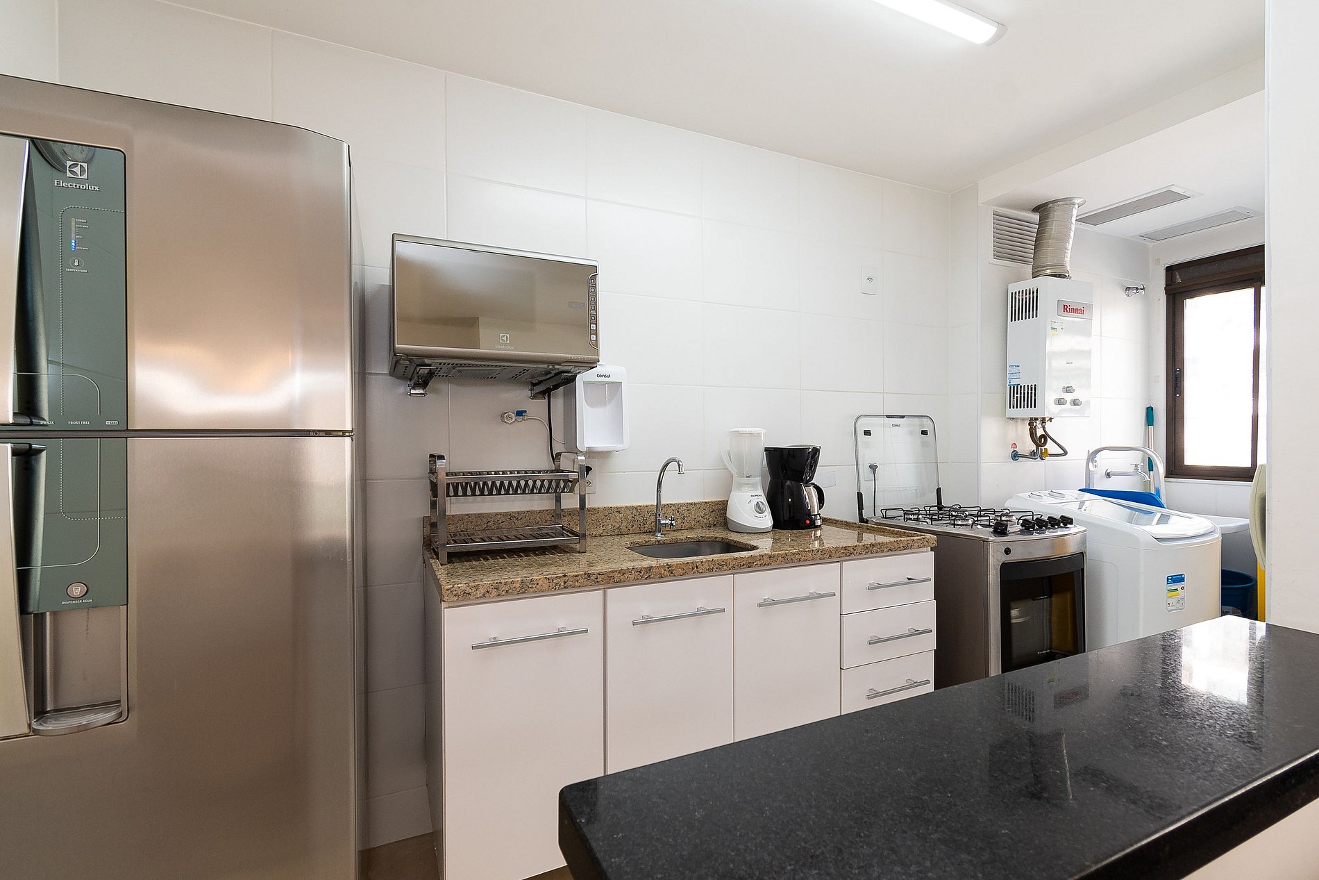 Na sala você encontrará uma Mesa de Jantar com 6 cadeiras, Sofá de 3 lugares + uma Poltrona reclinável. A Varanda está equipada com uma rede perfeita pra sonequinha da tarde, além de uma mesa com 4 cadeiras e tela de proteção, garantindo a segurança das crianças. A cozinha está completamente equipada com tudo que você precisa para sentir-se em casa; microondas, filtro de água, geladeira, máquina de café, pratos, panelas, talheres. Na Área de serviço você encontrará uma máquina de lavar, varal de roupas e utensílios de limpeza.