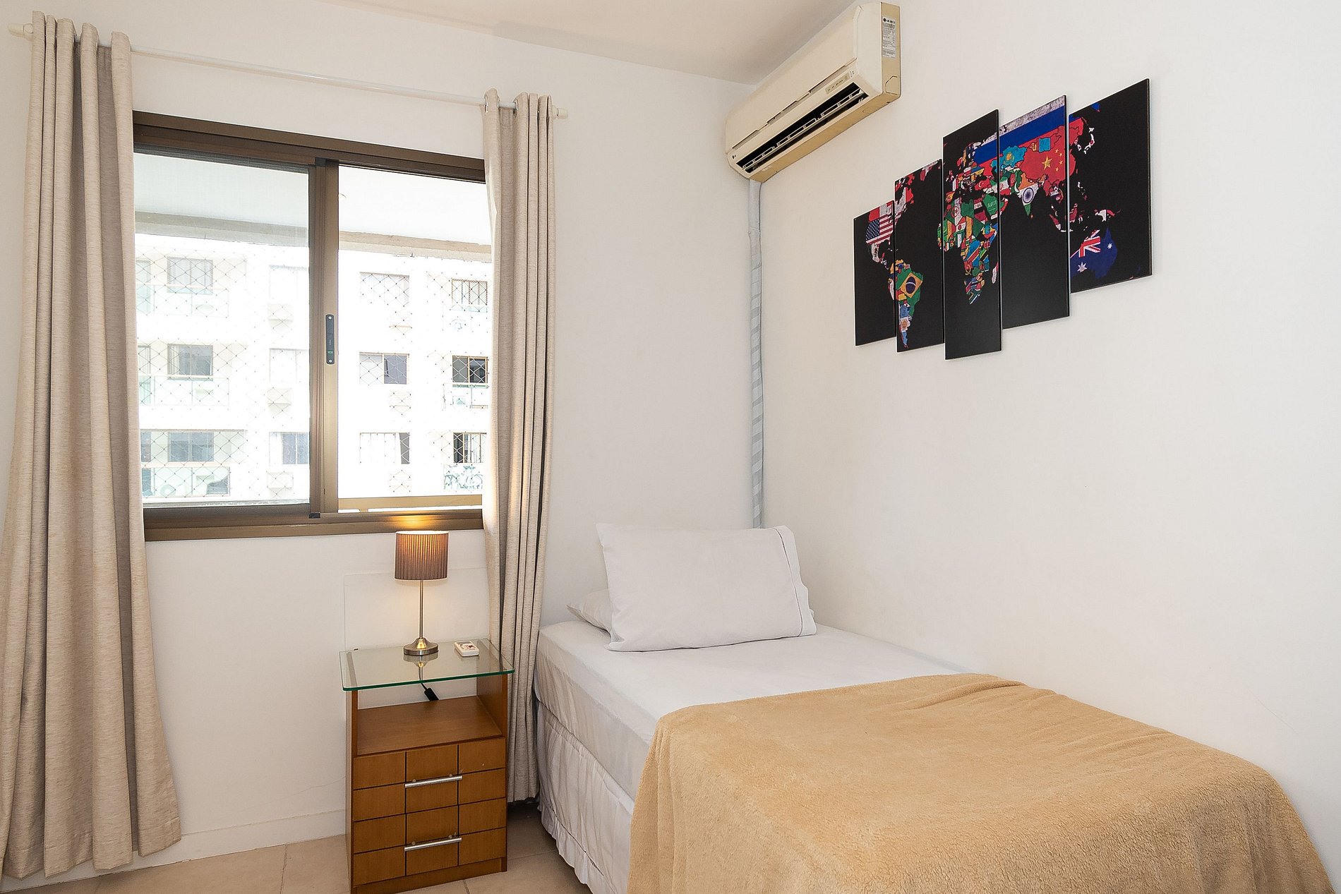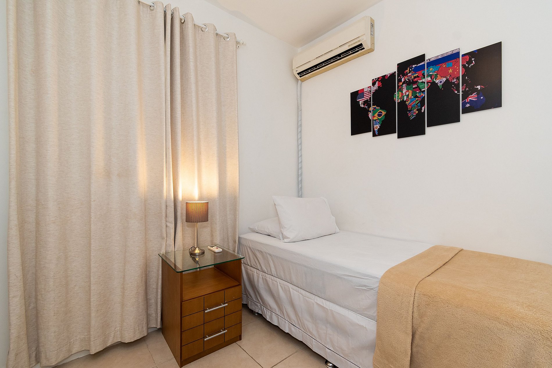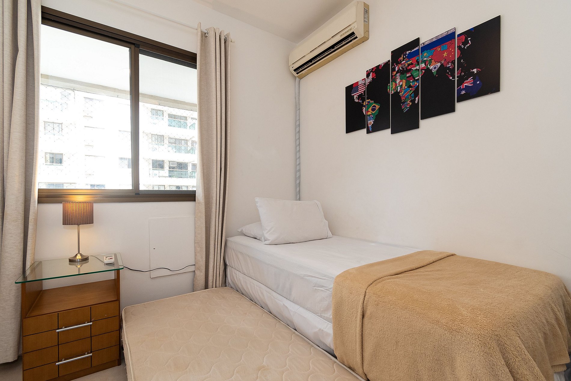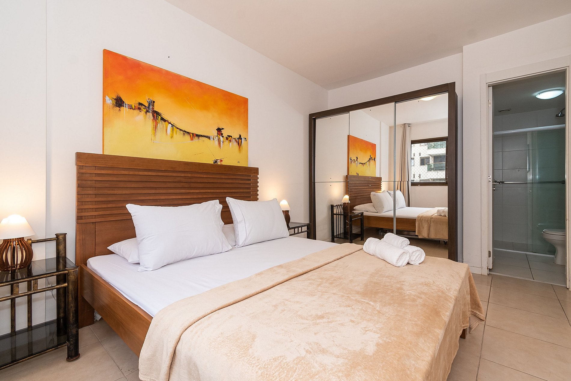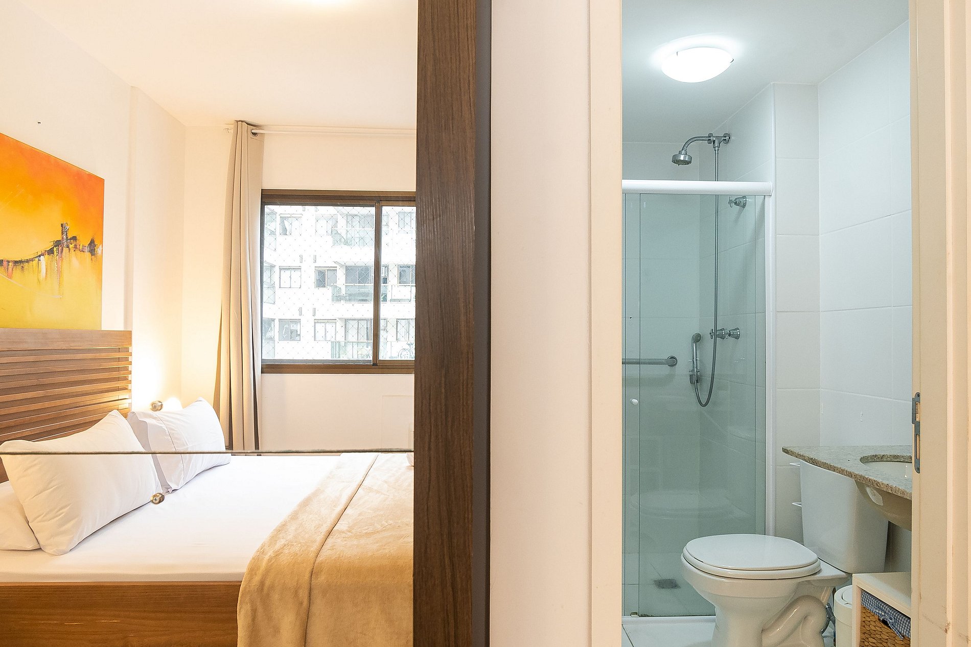 A Suíte está equipada com uma cama Queen-Size, Cortina Black-out, Ar-Condicionado e um guarda-roupas. Já o quarto de solteiro tem uma bi-cama, acomodando até 2 adultos confortavelmente, além de Ar-Condicionado Split e uma Arara de Roupas. Ambos os banheiros possuem Box de Vidro, sanitário e pia.