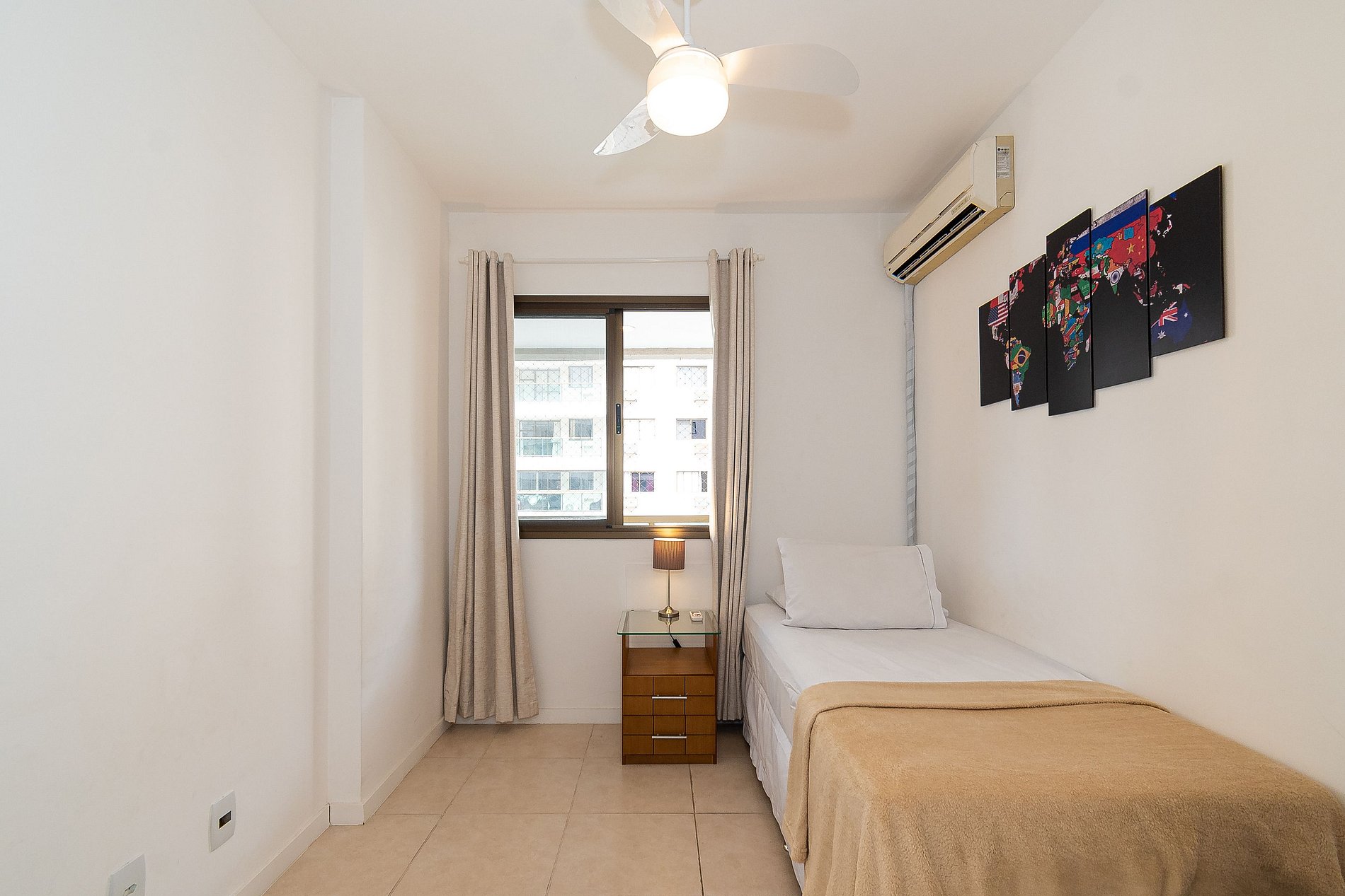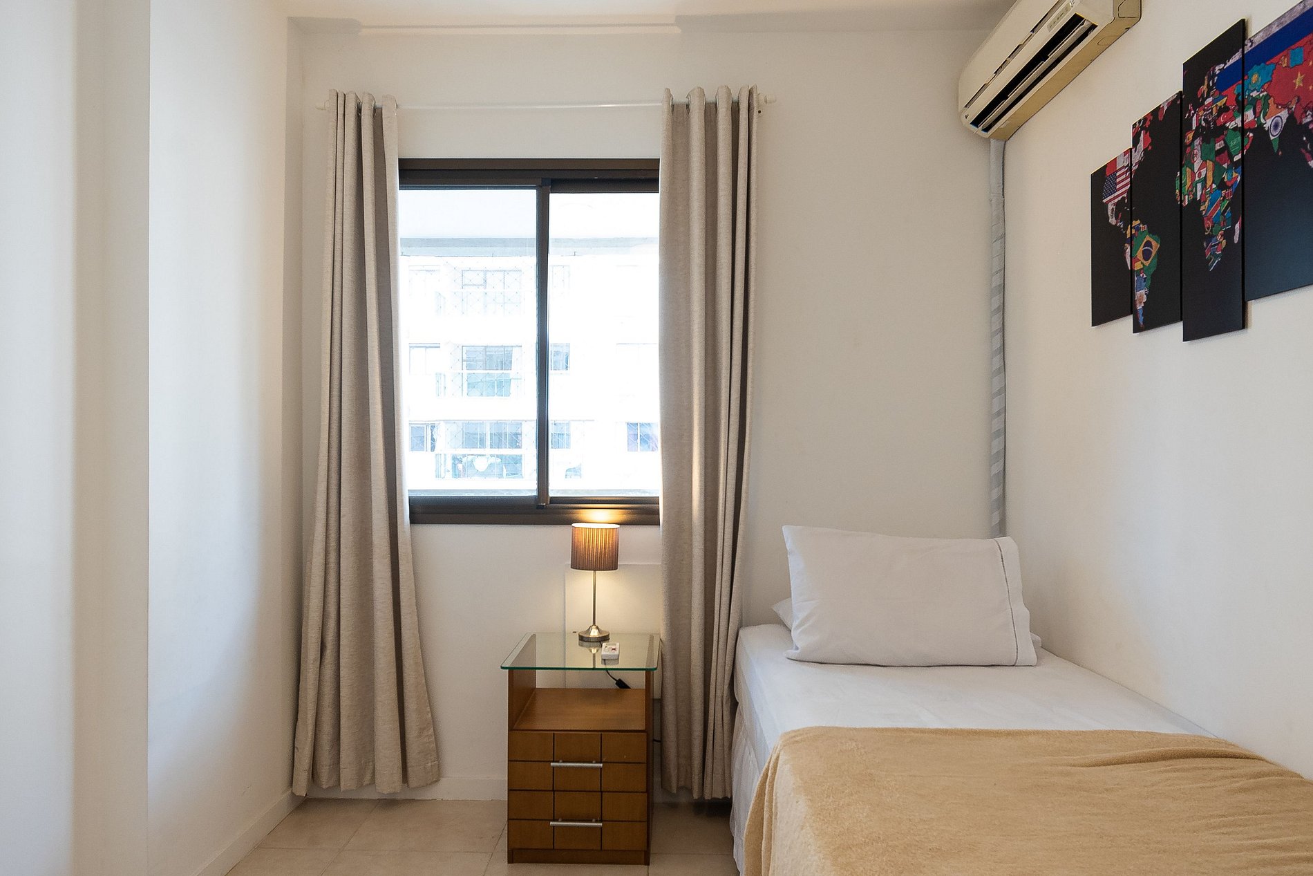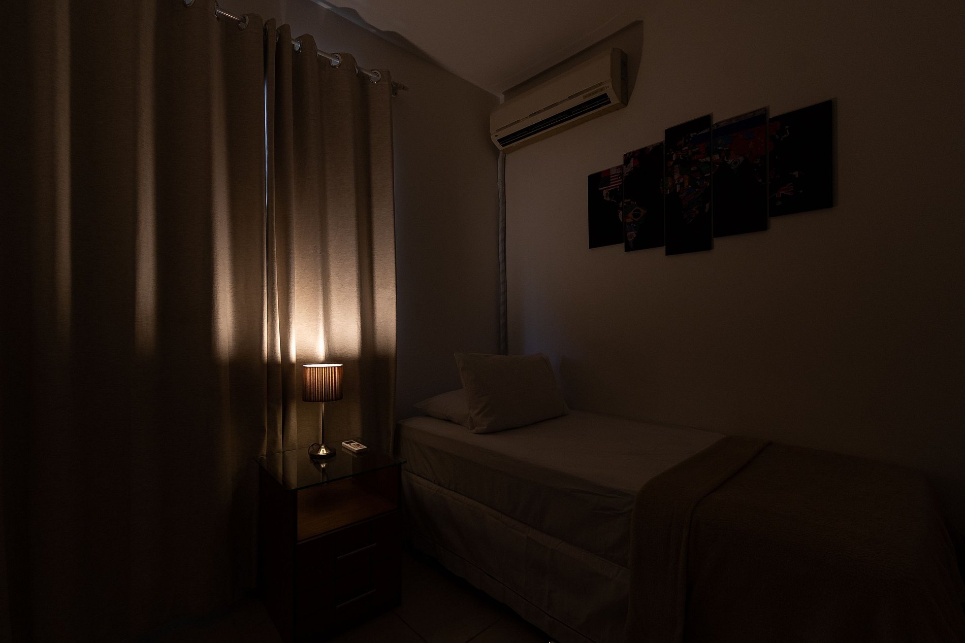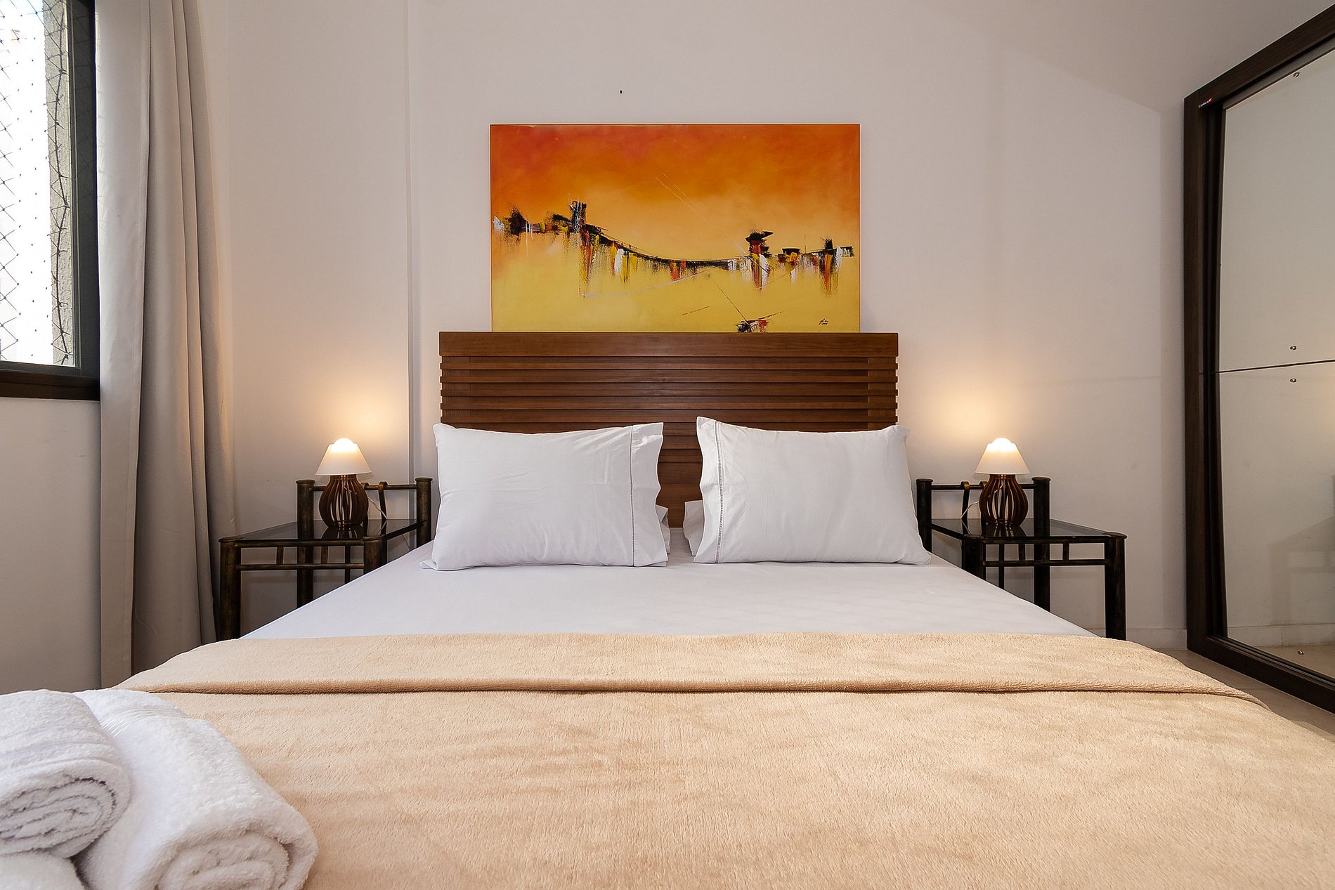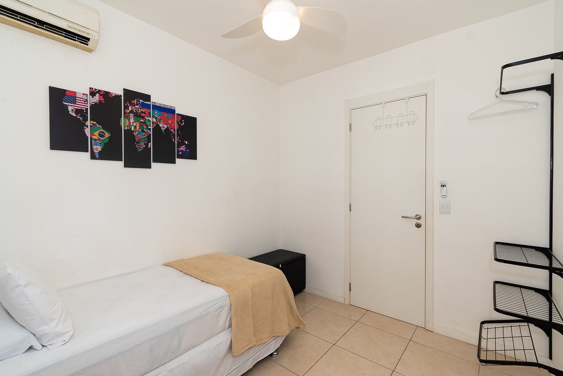 A Suíte está equipada com uma cama Queen-Size, Cortina Black-out, Ar-Condicionado e um guarda-roupas. Já o quarto de solteiro tem uma bi-cama, acomodando até 2 adultos confortavelmente, além de Ar-Condicionado Split e uma Arara de Roupas. Ambos os banheiros possuem Box de Vidro, sanitário e pia.