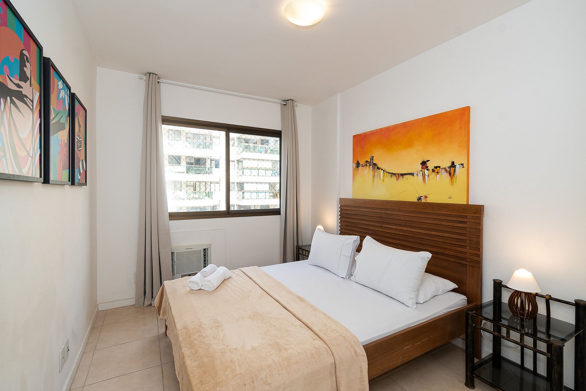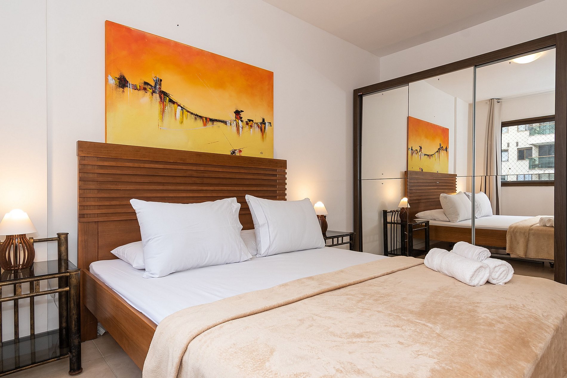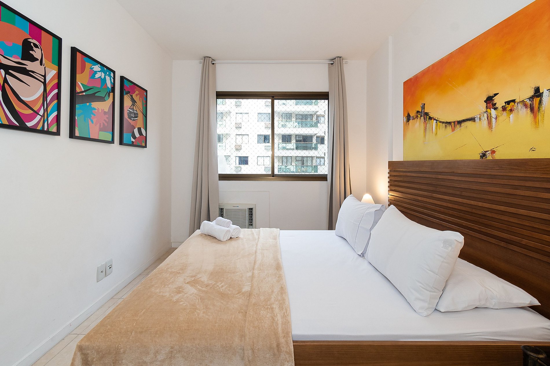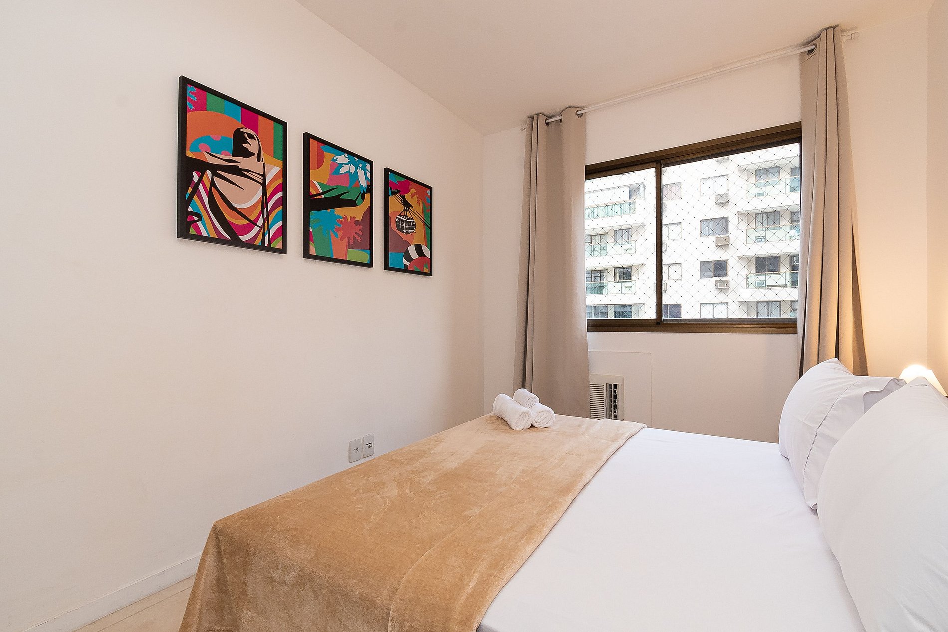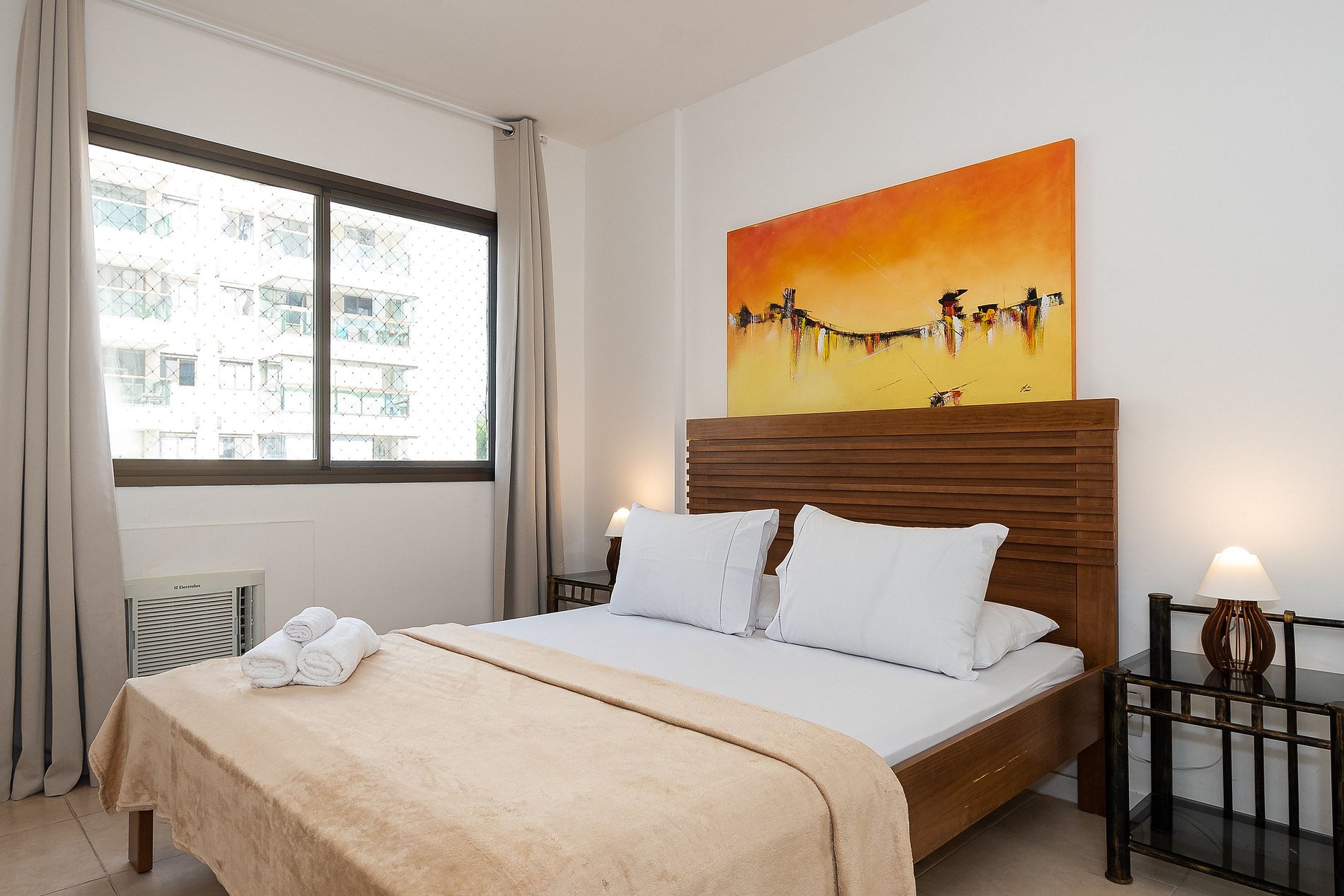 A Suíte está equipada com uma cama Queen-Size, Cortina Black-out, Ar-Condicionado e um guarda-roupas. Já o quarto de solteiro tem uma bi-cama, acomodando até 2 adultos confortavelmente, além de Ar-Condicionado Split e uma Arara de Roupas. Ambos os banheiros possuem Box de Vidro, sanitário e pia.