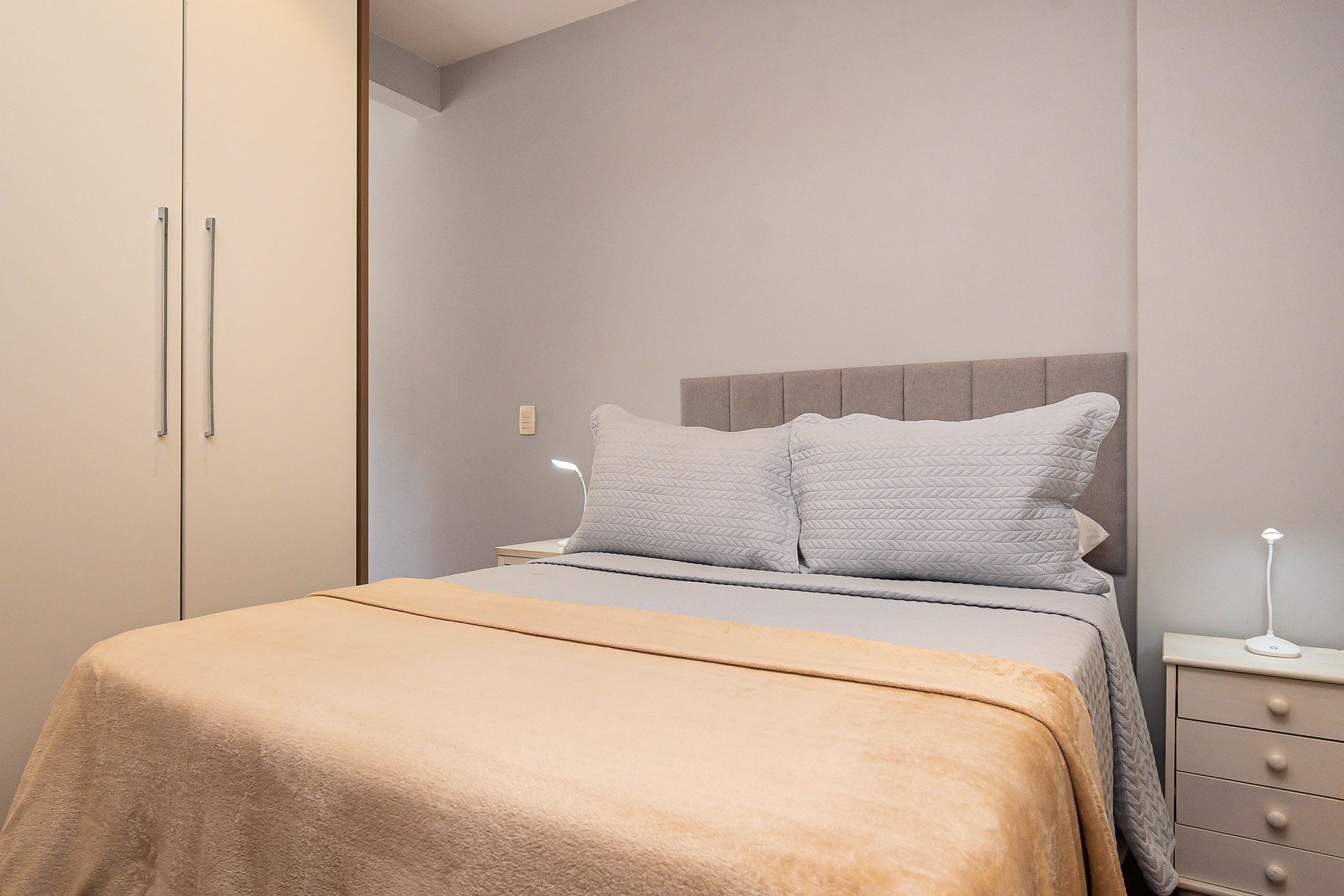 - O 2° quarto está equipado com ar-condicionado, cama de Casal, workstation, cortina Black-Out e armários.