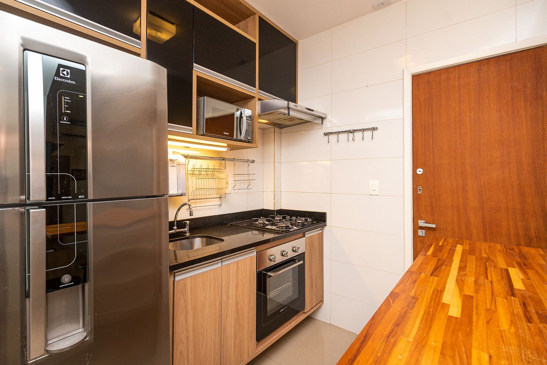 - A cozinha é completamente equipada com tudo necessário para você preparar as refeições do dia-a-dia; Geladeira, Fogão, Forno, Filtro de Água e Cafeteira elétrica. Além disso o espaço dispõe de pratos, copos, xícaras, talheres e demais utensílios de cozinha.
