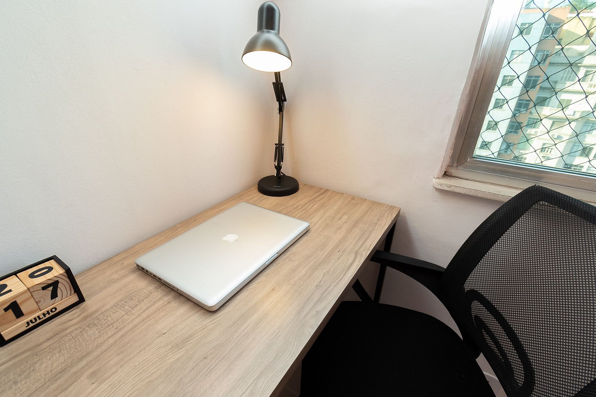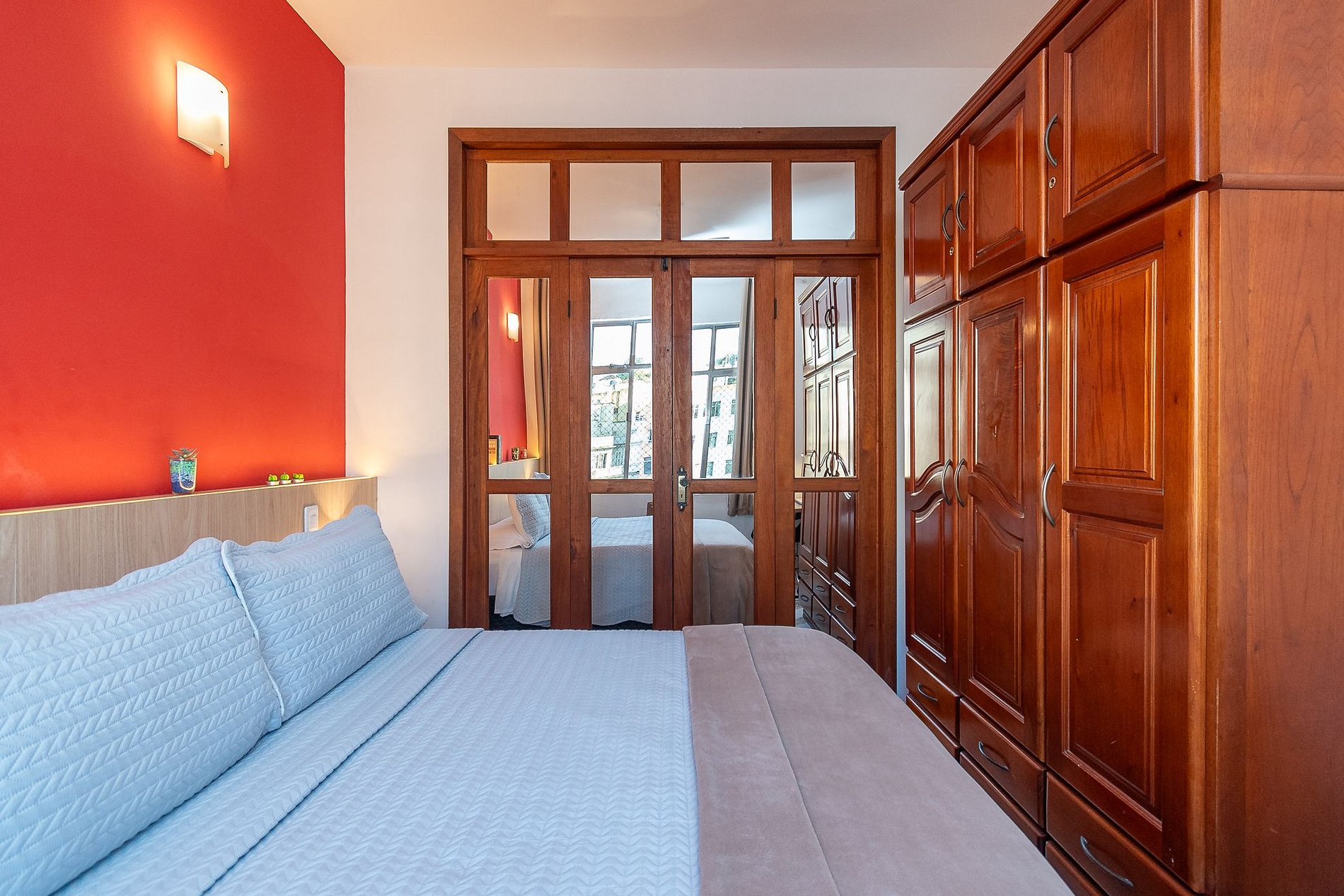 - O dormitório está equipado com ar-condicionado, cama de Casal, cortina Black-Out, ventilador de teto, armário Guarda-Roupa e uma workstation;