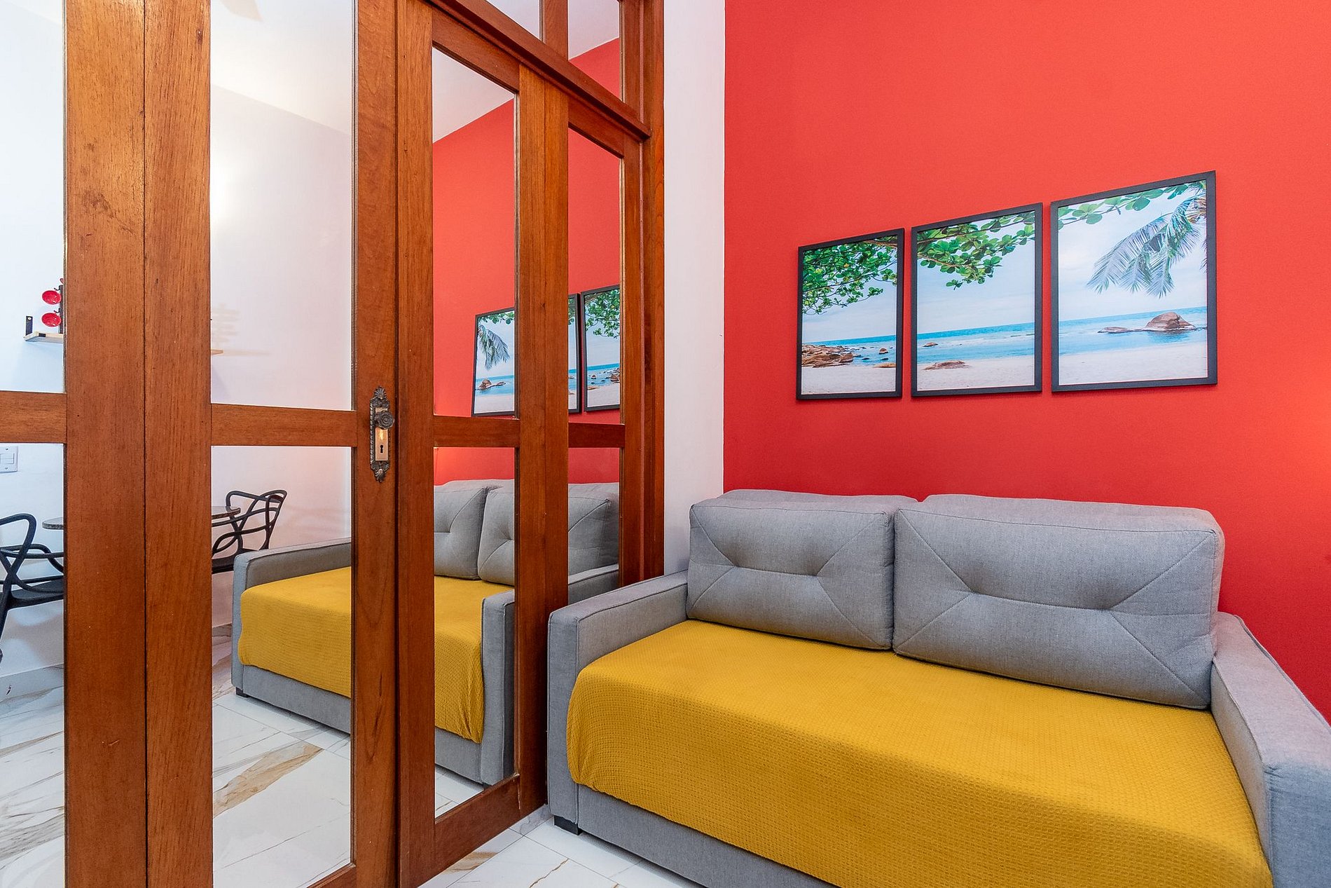 - A sala está equipada com um confortável sofá, SmartTv, ventilador de teto, mesa de jantar com 3 lugares, geladeira e cafeteira elétrica