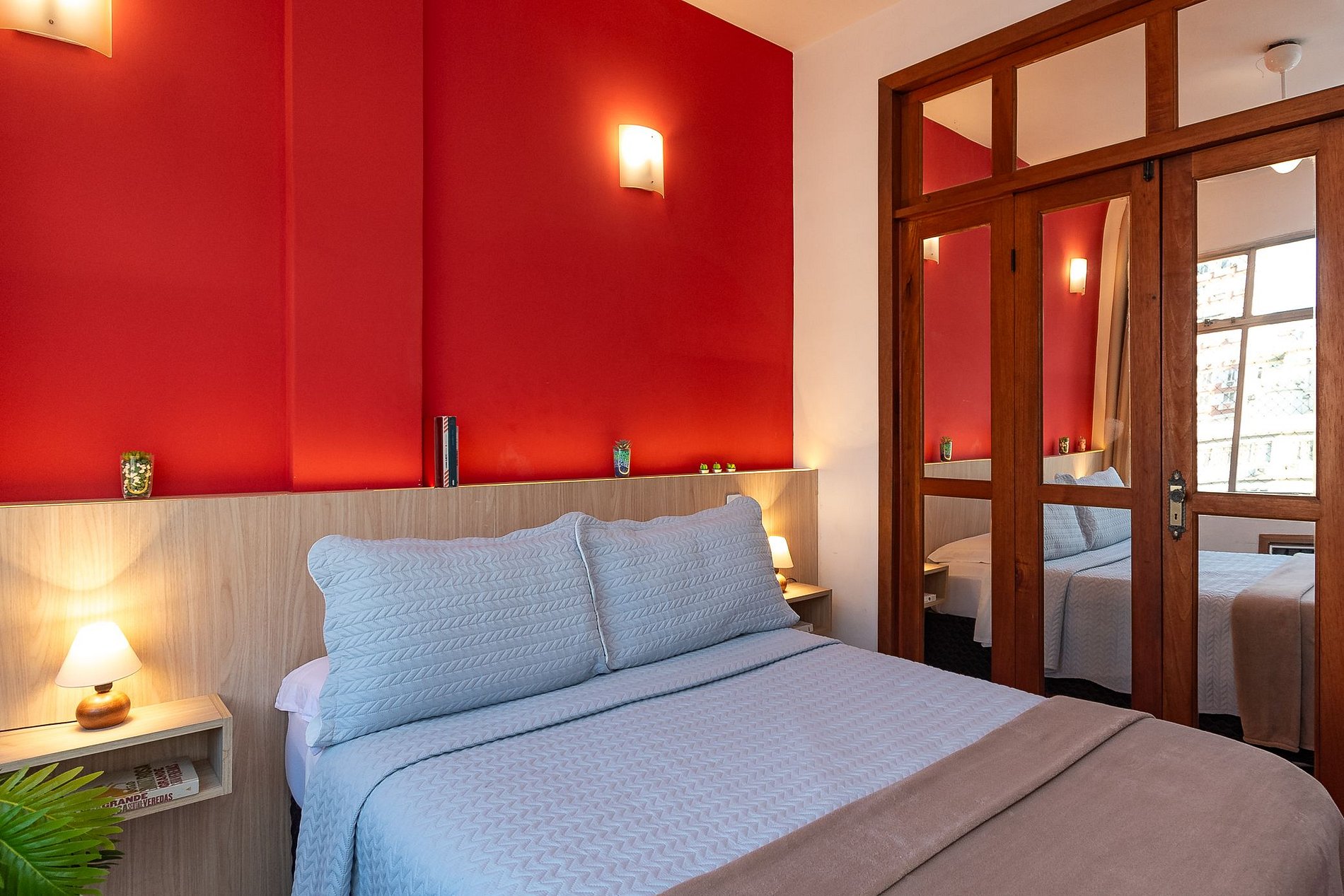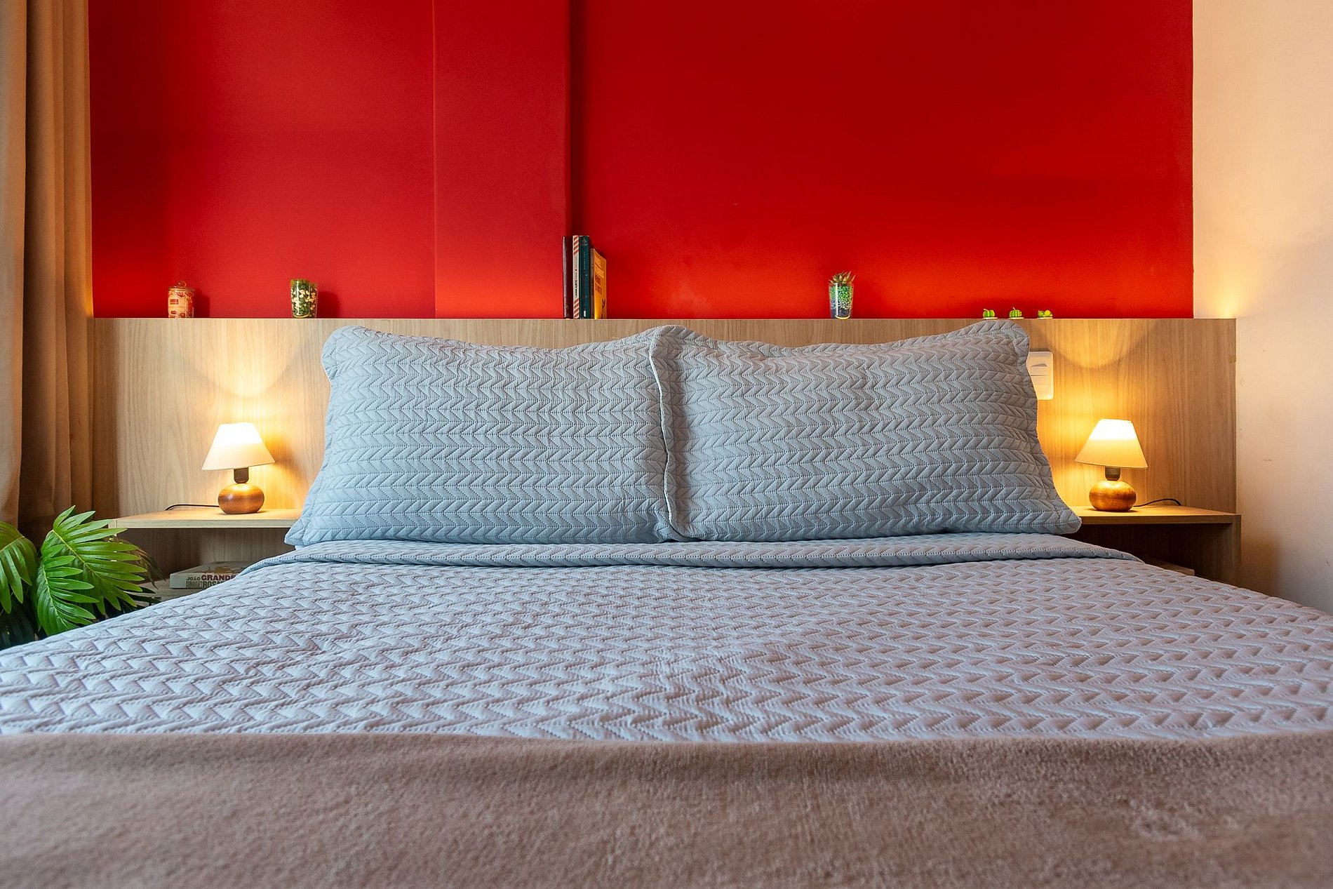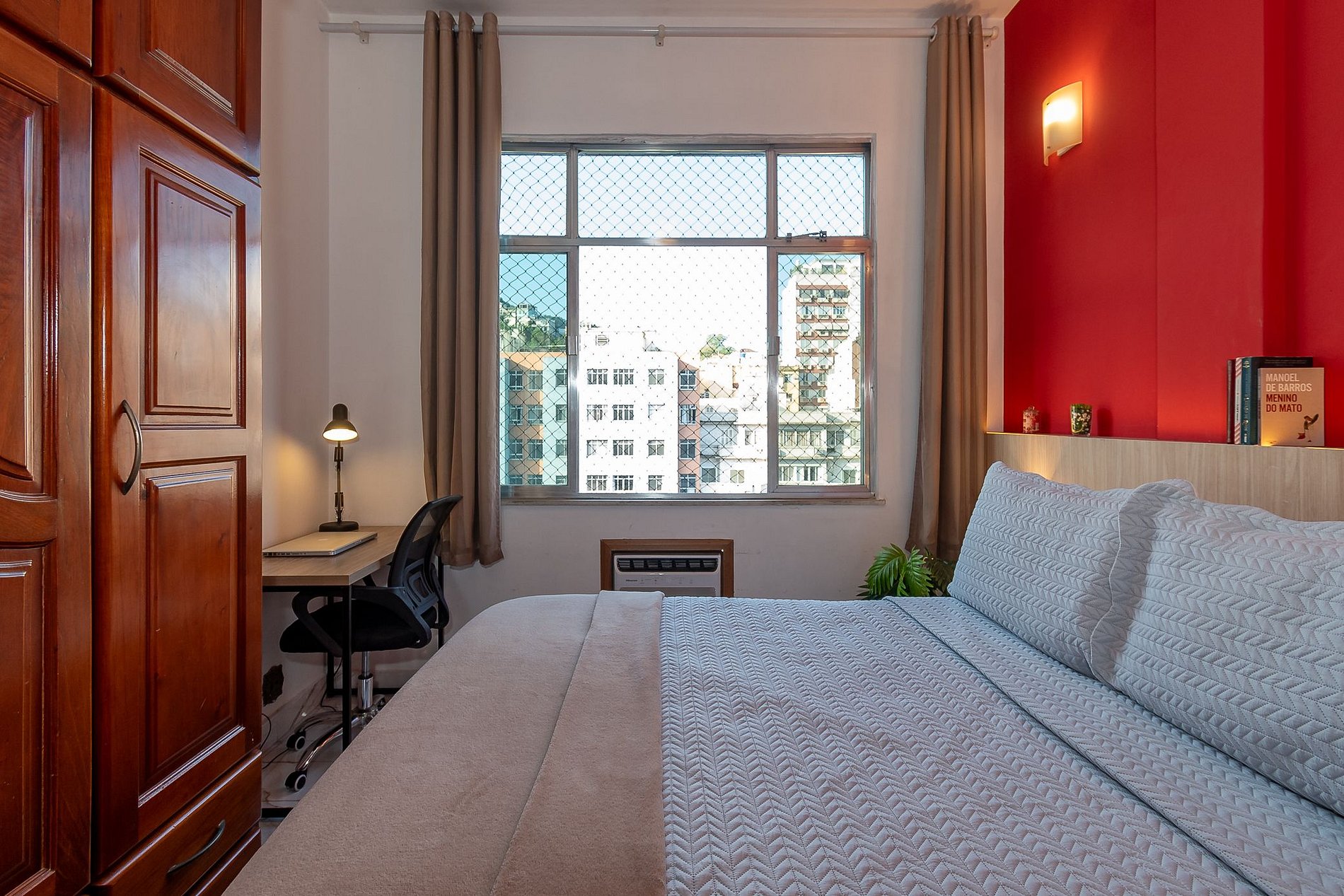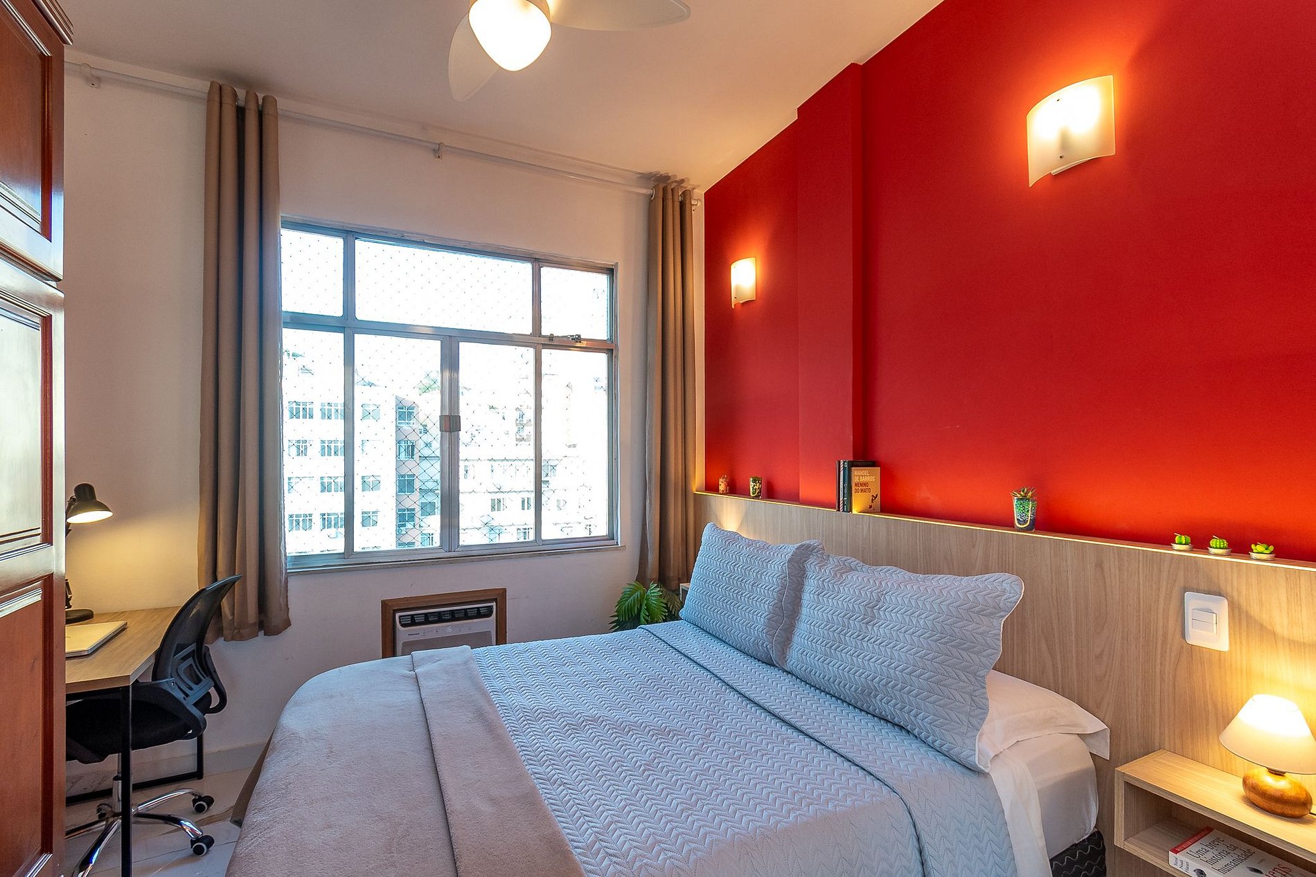 - O dormitório está equipado com ar-condicionado, cama de Casal, cortina Black-Out, ventilador de teto, armário Guarda-Roupa e uma workstation;