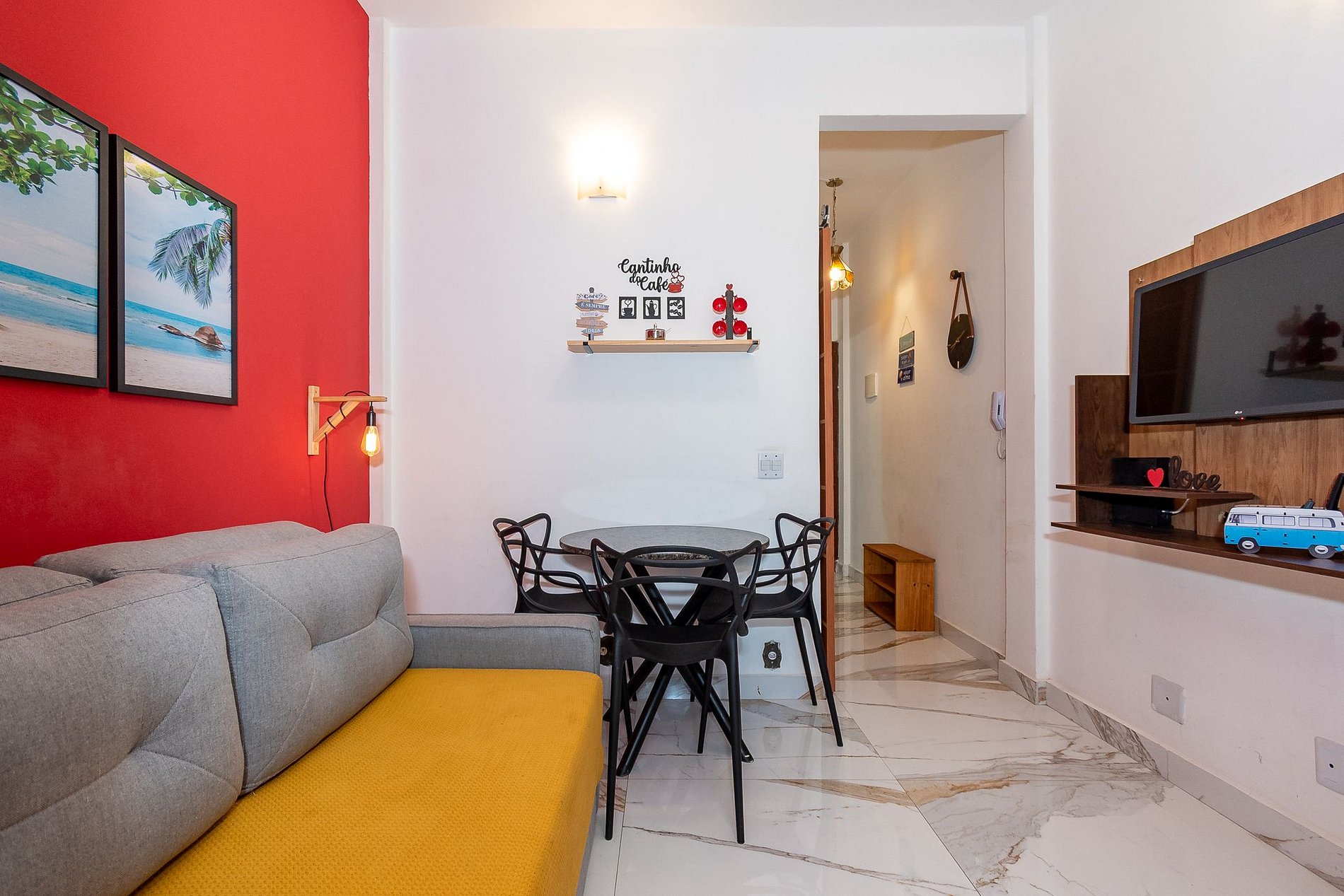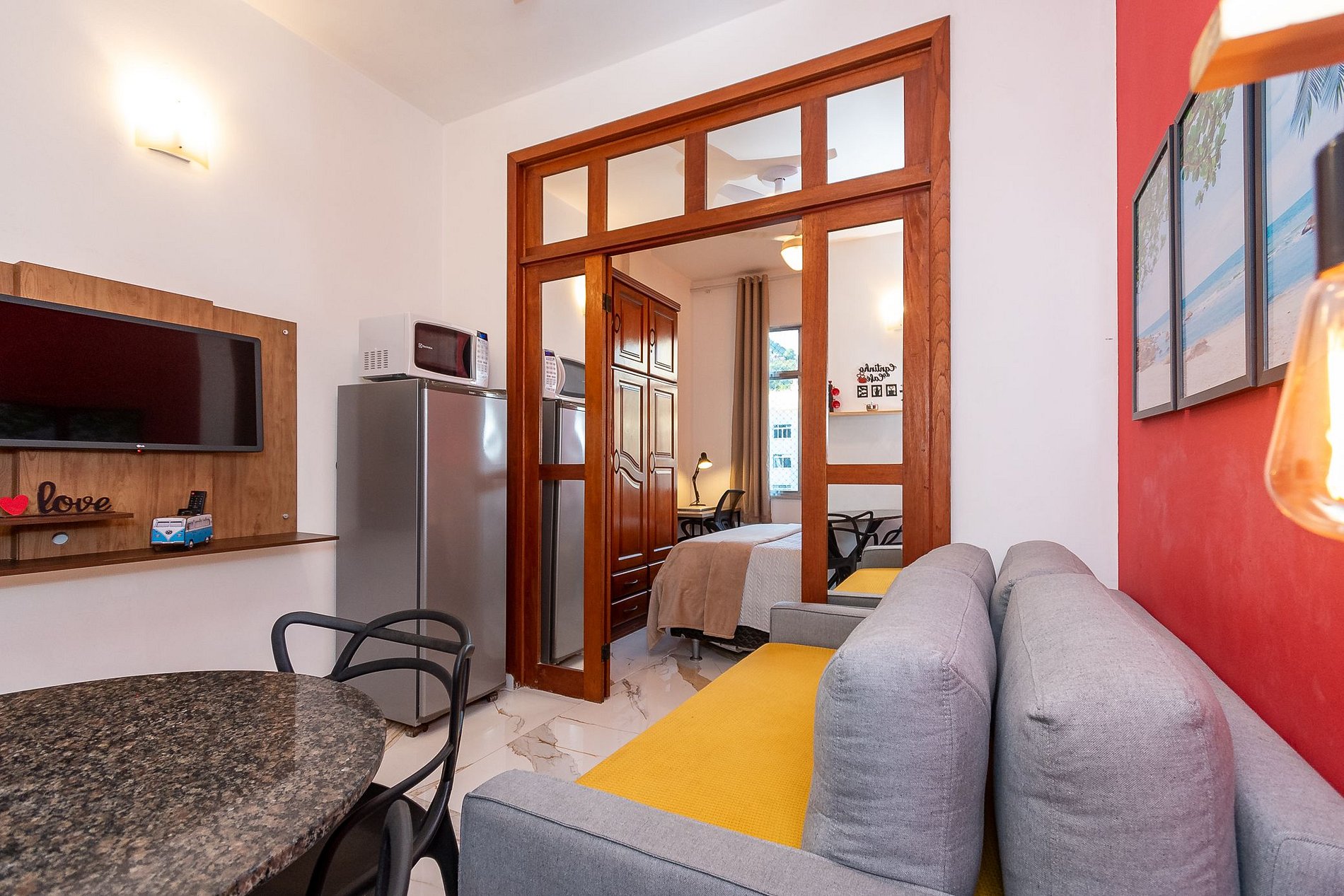 - A sala está equipada com um confortável sofá, SmartTv, ventilador de teto, mesa de jantar com 3 lugares, geladeira e cafeteira elétrica