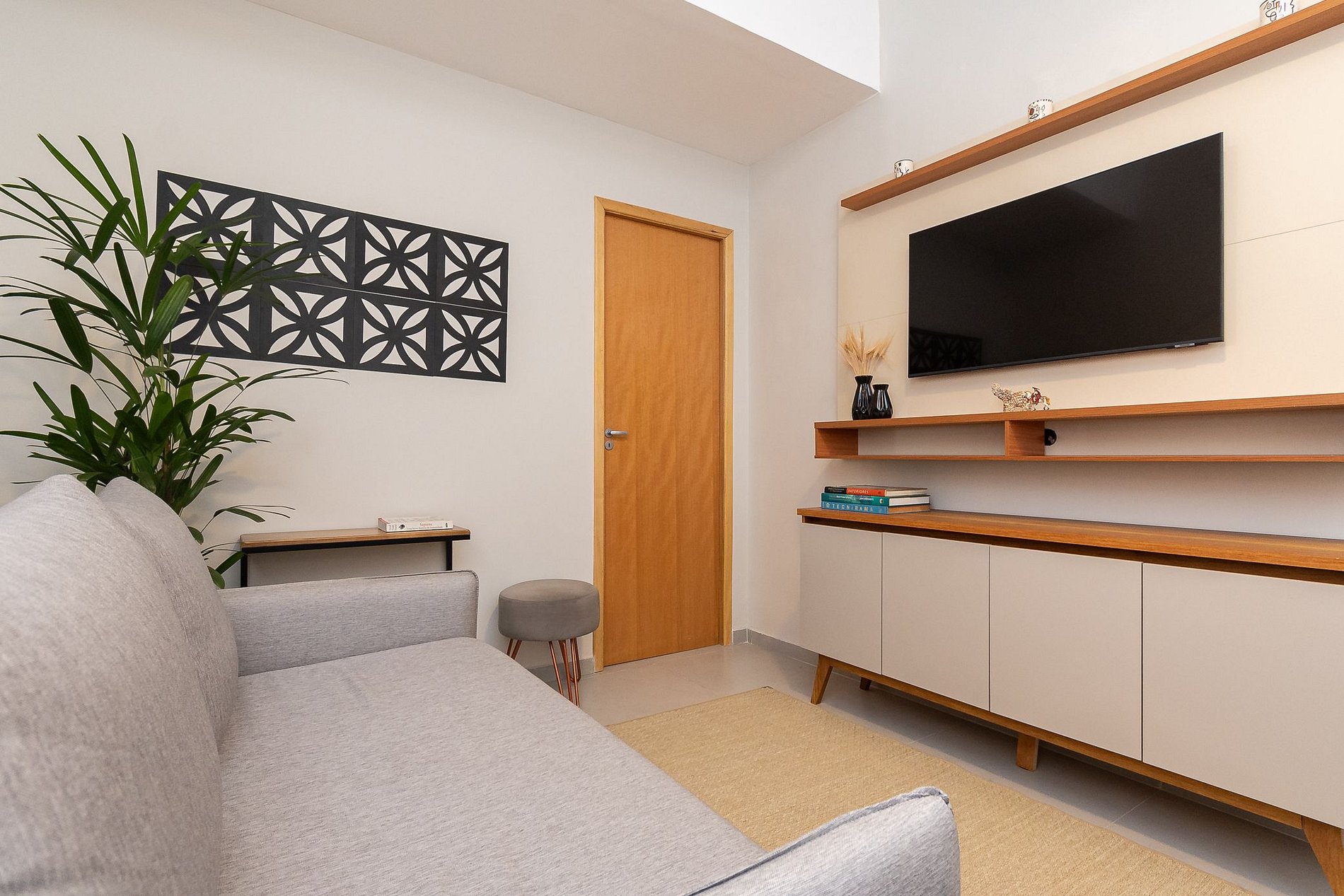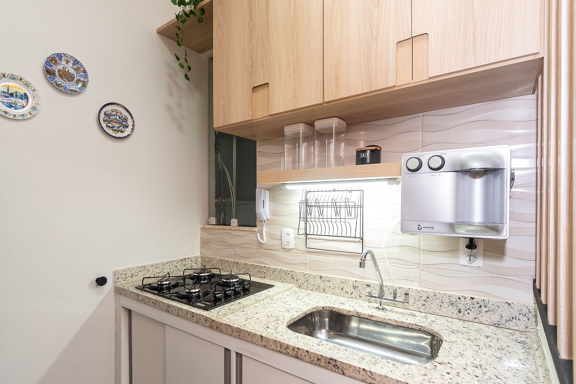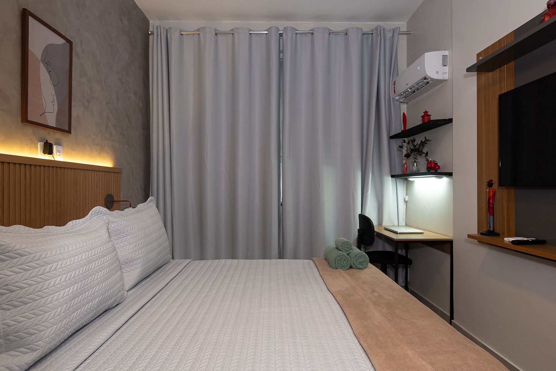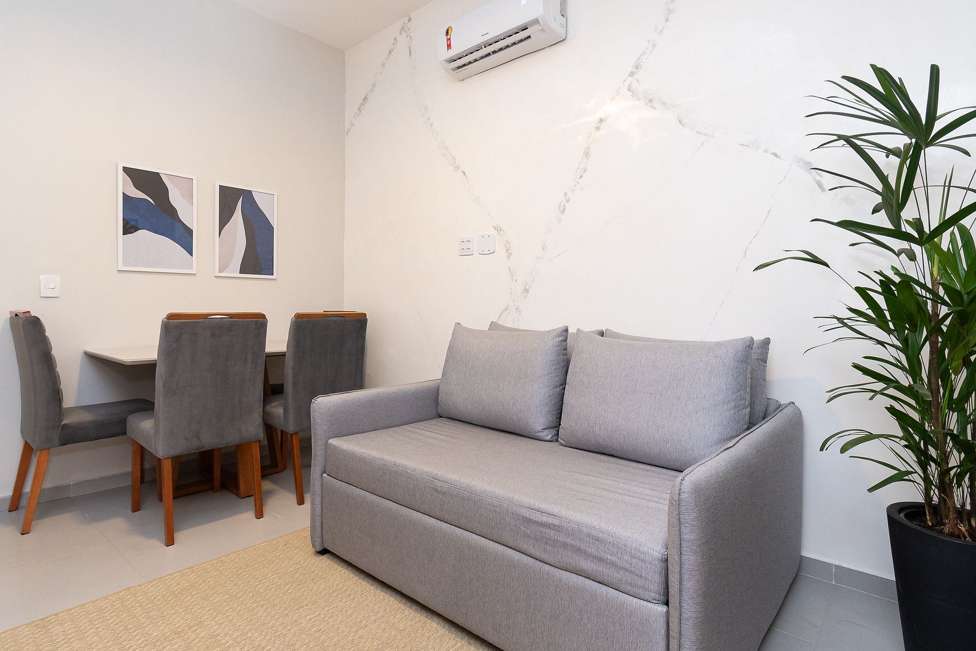 Espaço dedicado à hospitalidade, completo com todas as facilidades para uma estadia confortável e agradável. O quarto está equipado com uma cama Queen-Size, ar-condicionado split, SmartTV e estação de trabalho. A sala de estar possui ar-condicionado split, SmartTV, sofá-cama e mesa de jantar com quatro cadeiras. A cozinha está totalmente equipada com tudo que você precisa para se sentir em casa: micro-ondas, fogão a gás de quatro bocas, geladeira, máquina de café, liquidificador, pratos, panelas e talheres. O banheiro tem box com chuveiro elétrico e secador de cabelo.