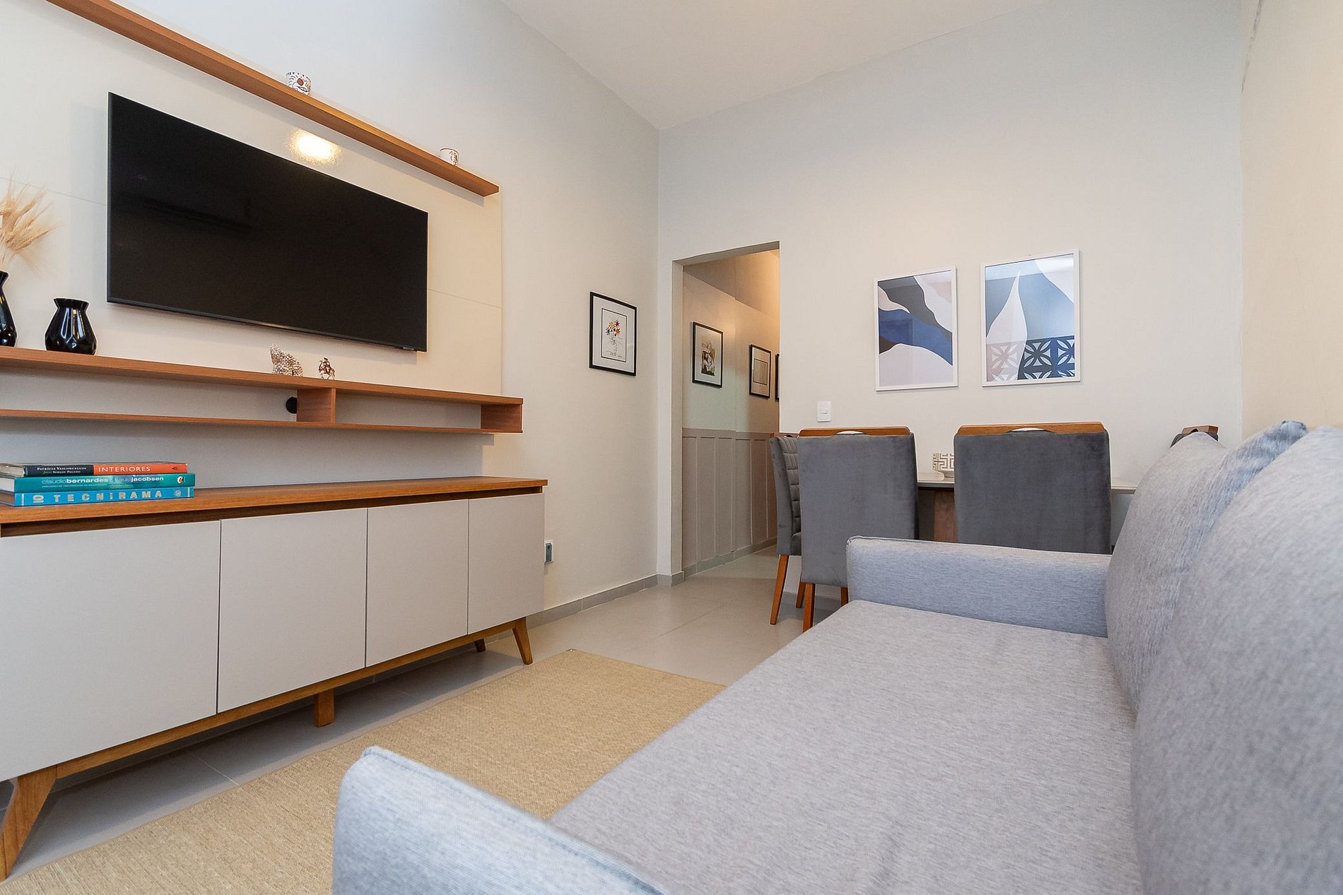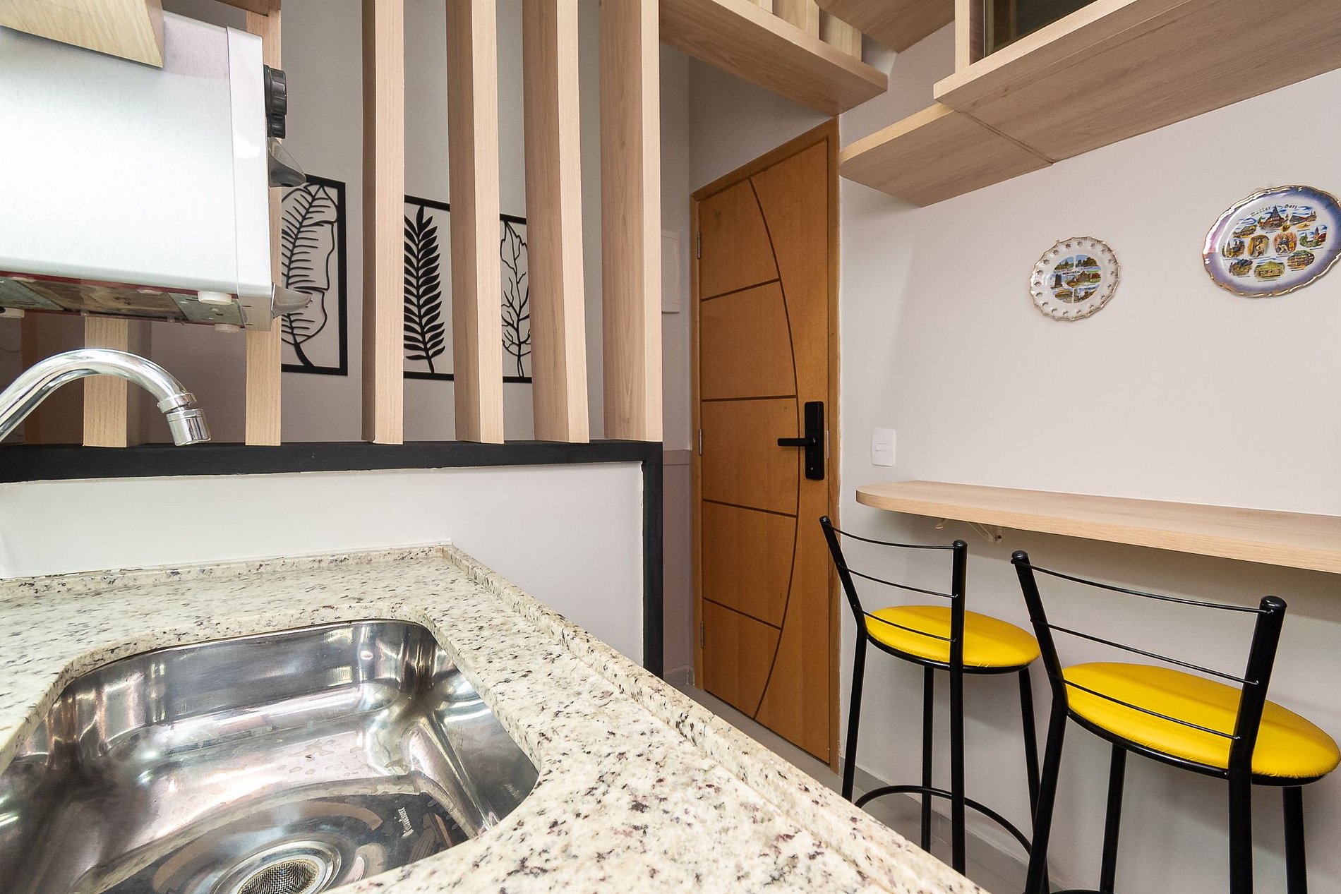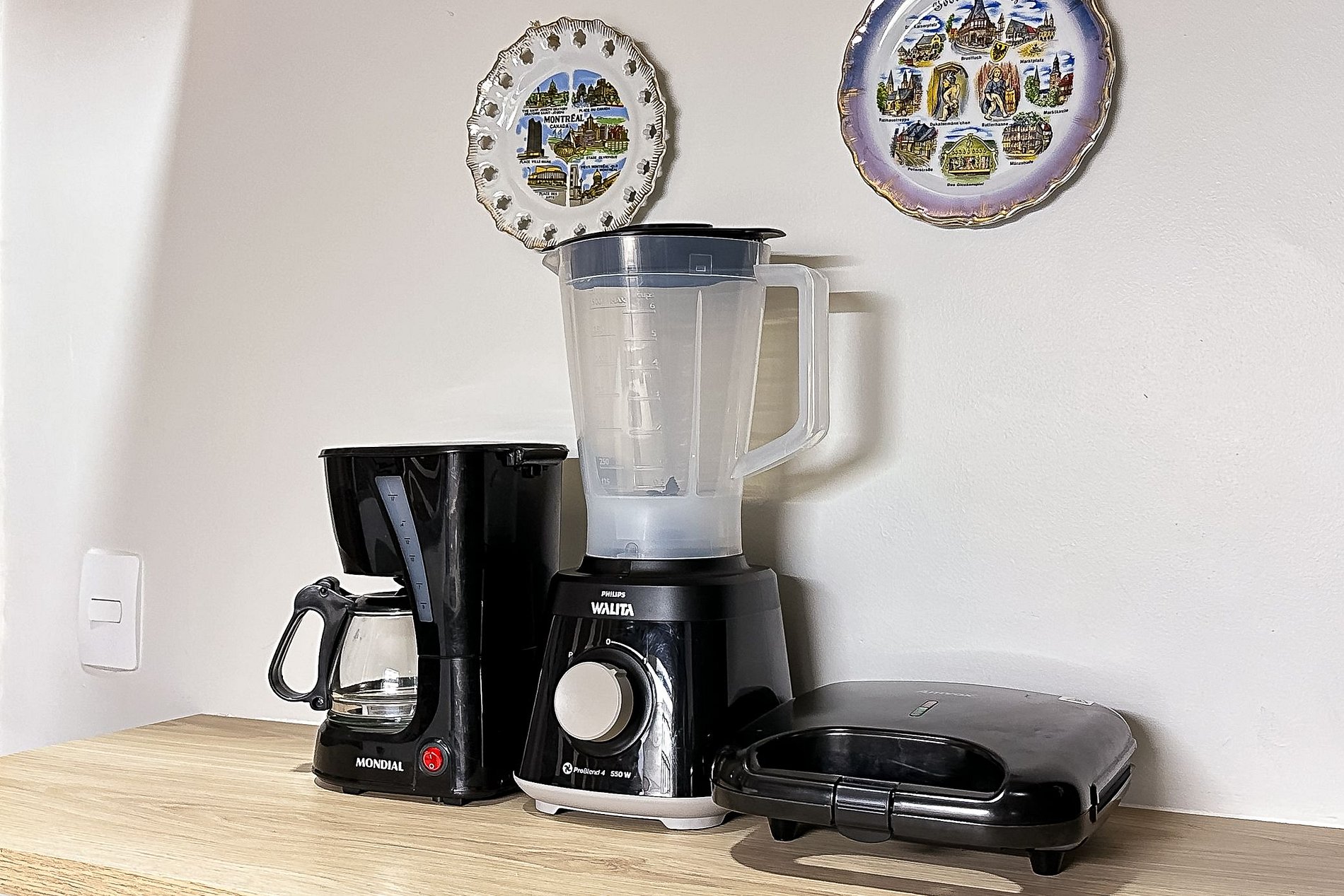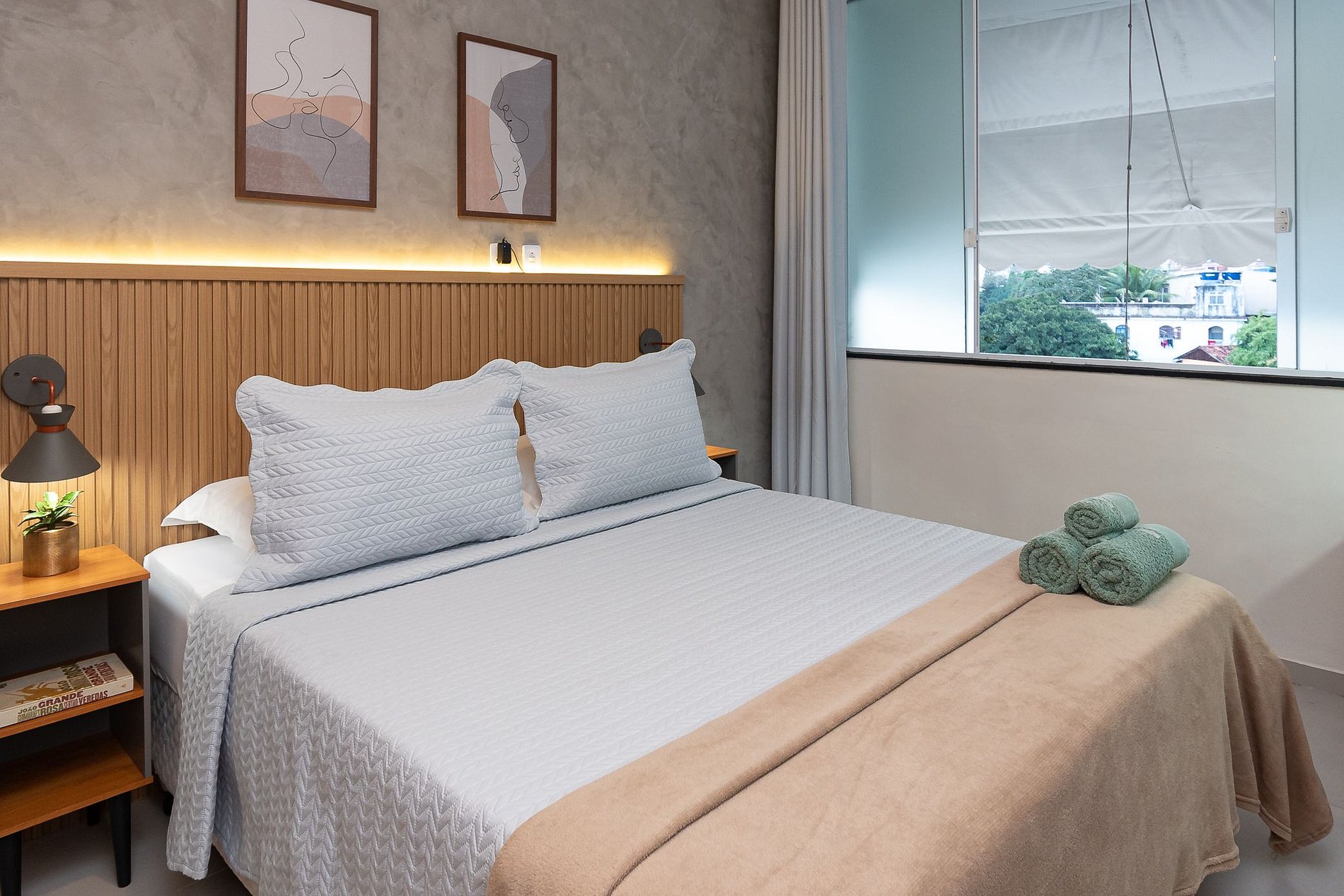Espaço dedicado à hospitalidade, completo com todas as facilidades para uma estadia confortável e agradável. O quarto está equipado com uma cama Queen-Size, ar-condicionado split, SmartTV e estação de trabalho. A sala de estar possui ar-condicionado split, SmartTV, sofá-cama e mesa de jantar com quatro cadeiras. A cozinha está totalmente equipada com tudo que você precisa para se sentir em casa: micro-ondas, fogão a gás de quatro bocas, geladeira, máquina de café, liquidificador, pratos, panelas e talheres. O banheiro tem box com chuveiro elétrico e secador de cabelo.