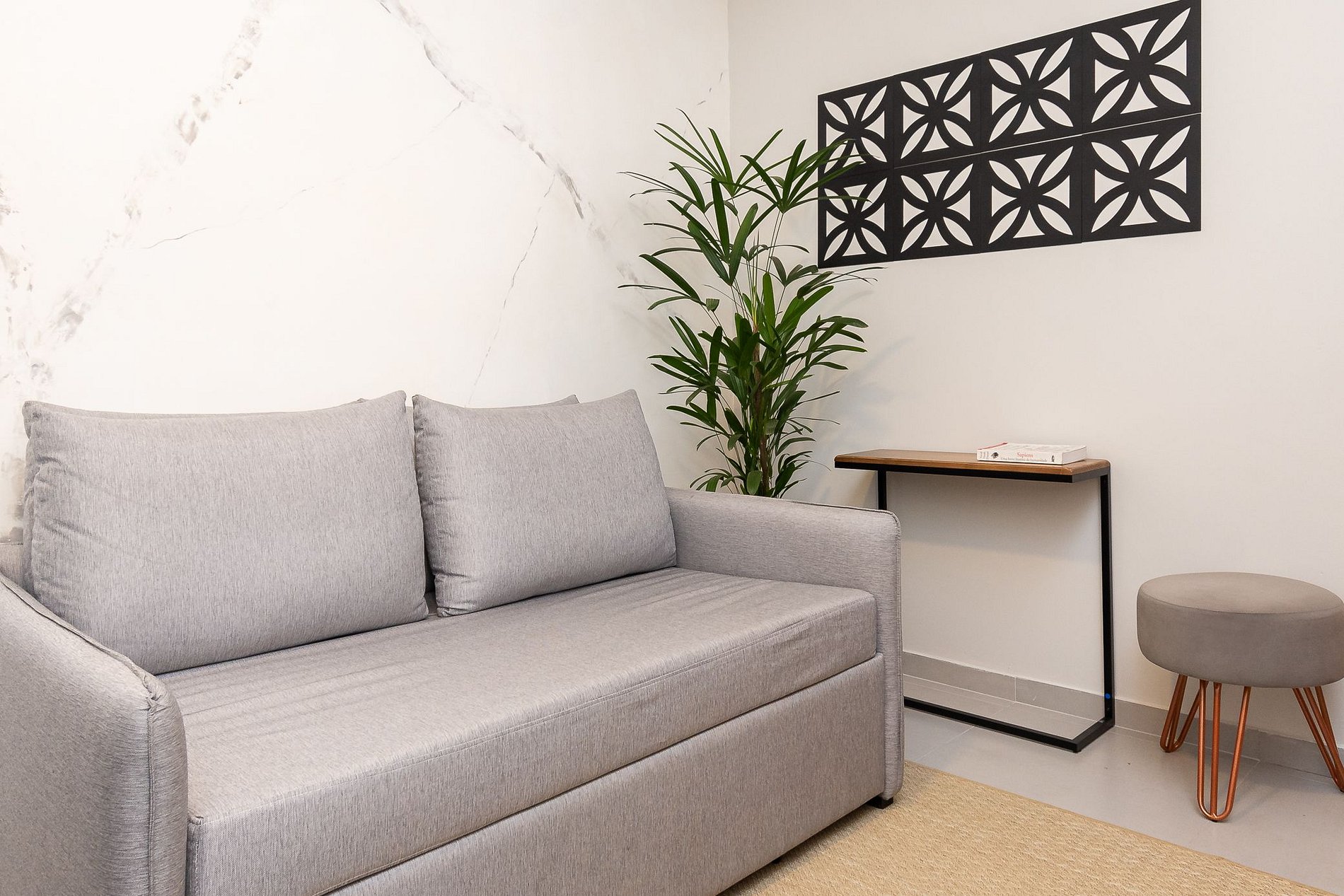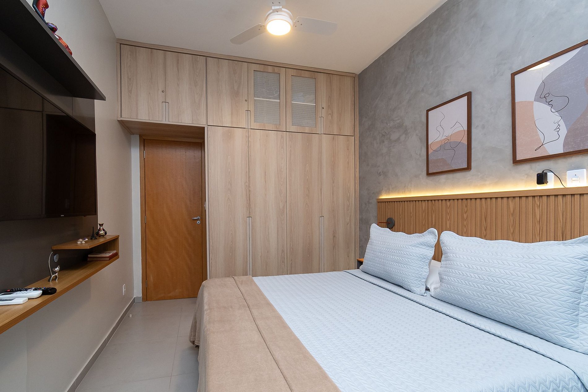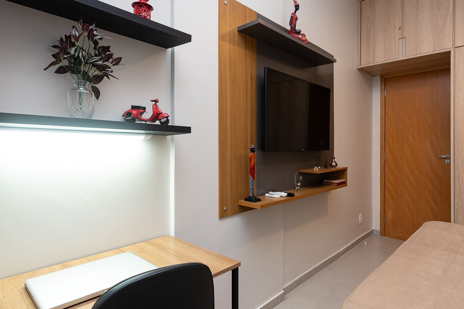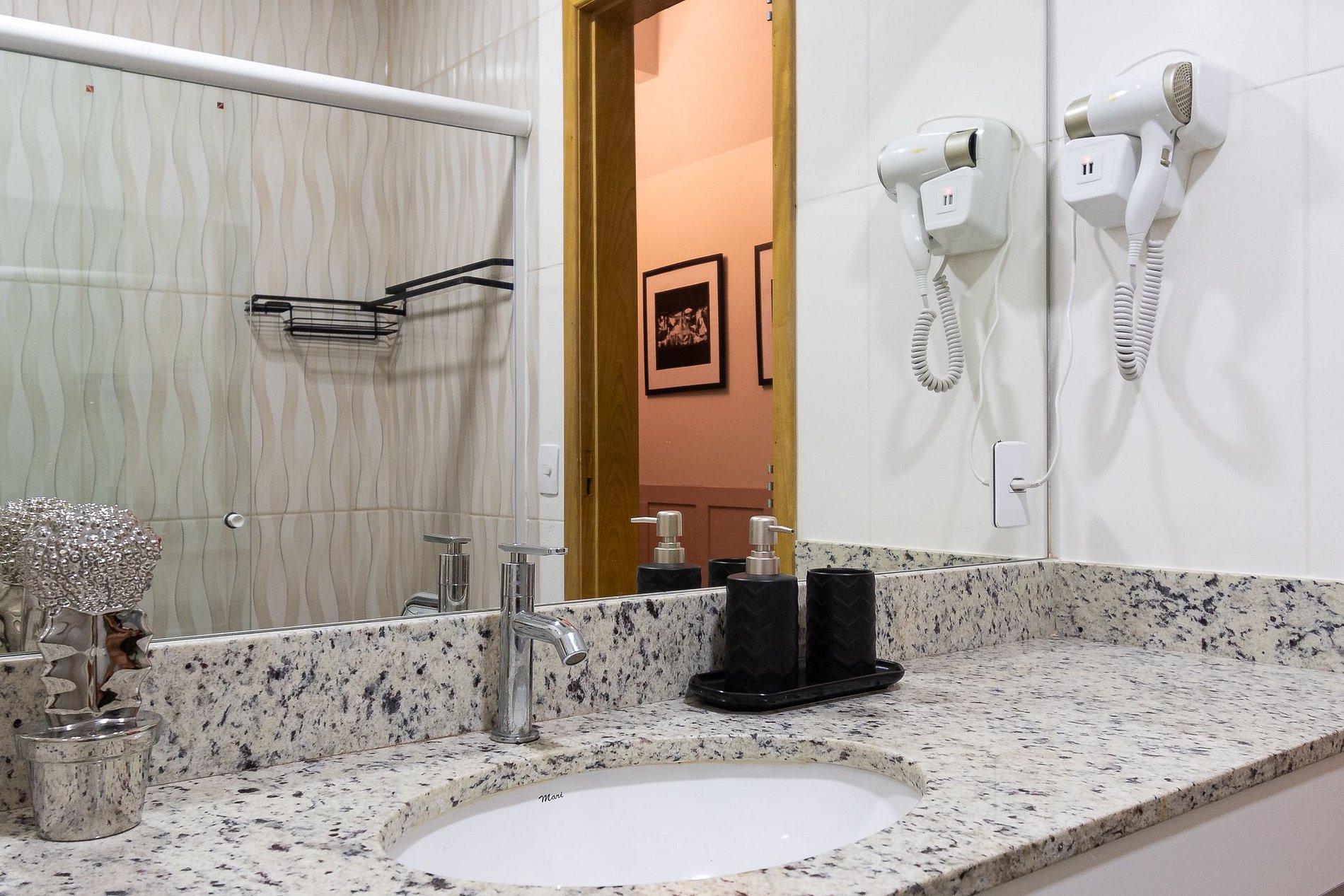 Espaço dedicado à hospitalidade, completo com todas as facilidades para uma estadia confortável e agradável. O quarto está equipado com uma cama Queen-Size, ar-condicionado split, SmartTV e estação de trabalho. A sala de estar possui ar-condicionado split, SmartTV, sofá-cama e mesa de jantar com quatro cadeiras. A cozinha está totalmente equipada com tudo que você precisa para se sentir em casa: micro-ondas, fogão a gás de quatro bocas, geladeira, máquina de café, liquidificador, pratos, panelas e talheres. O banheiro tem box com chuveiro elétrico e secador de cabelo.