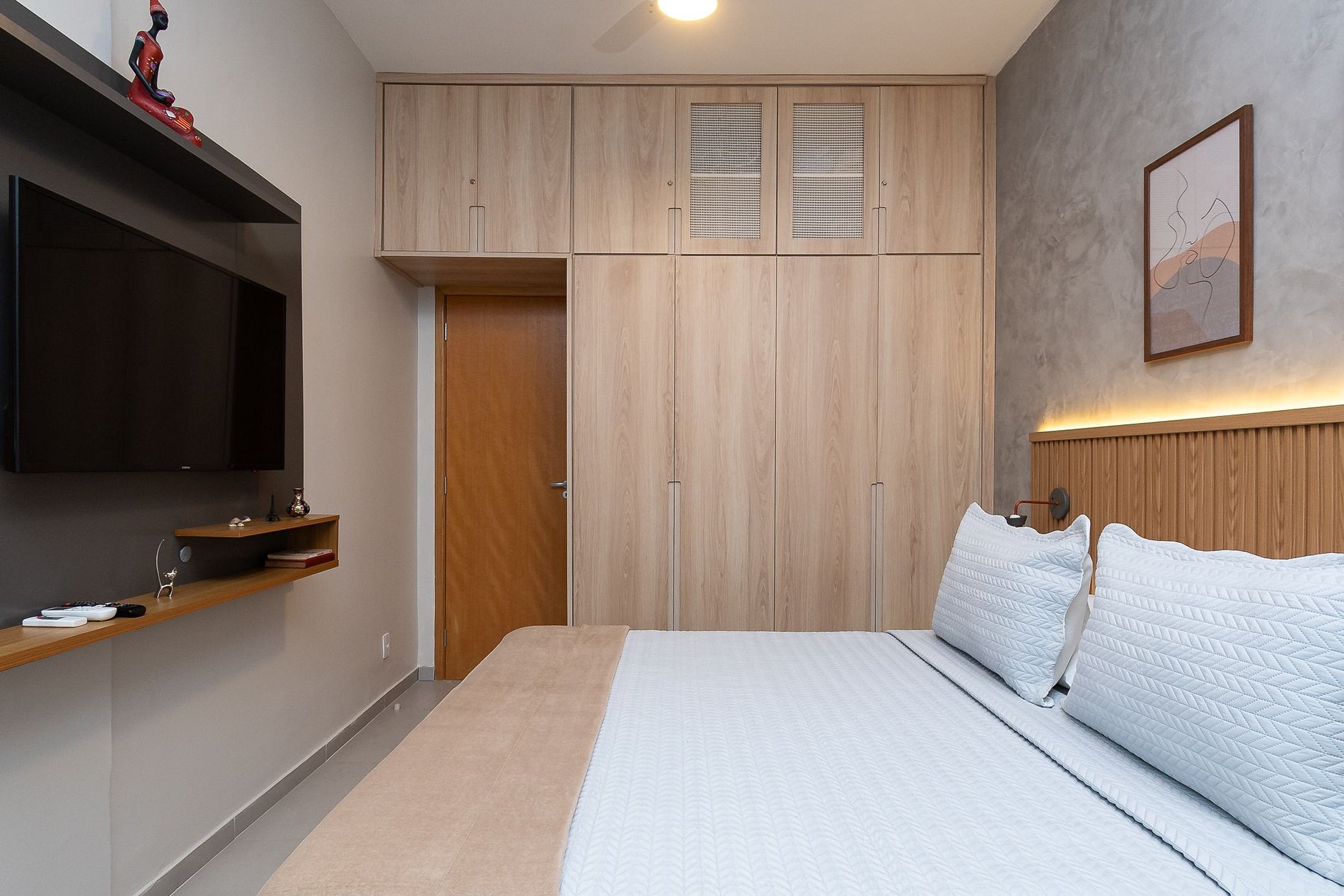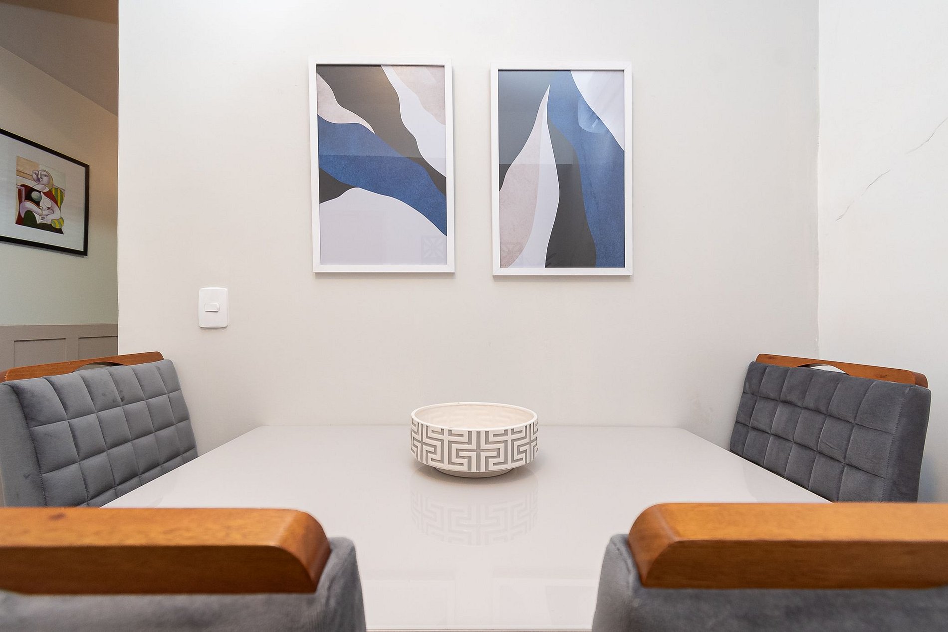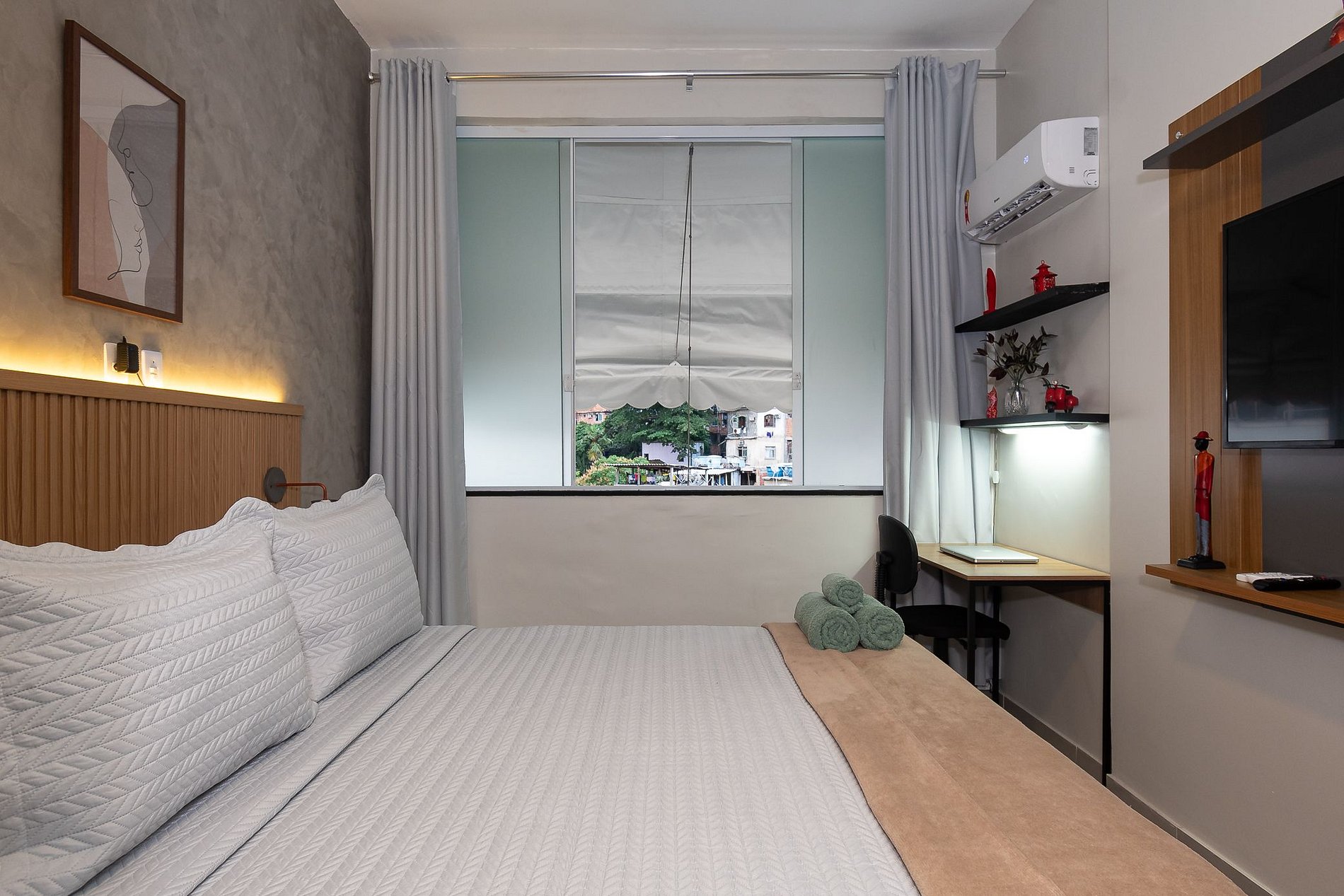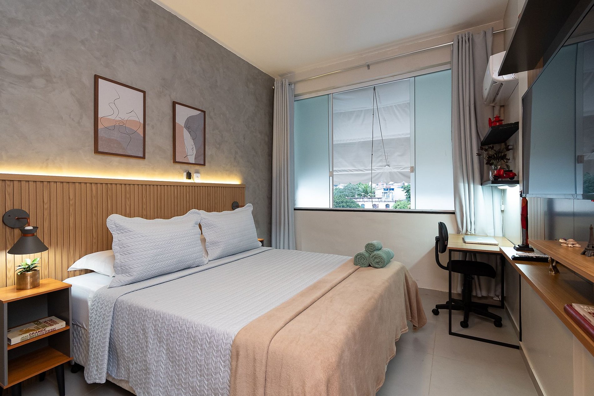 Espaço dedicado à hospitalidade, completo com todas as facilidades para uma estadia confortável e agradável. O quarto está equipado com uma cama Queen-Size, ar-condicionado split, SmartTV e estação de trabalho. A sala de estar possui ar-condicionado split, SmartTV, sofá-cama e mesa de jantar com quatro cadeiras. A cozinha está totalmente equipada com tudo que você precisa para se sentir em casa: micro-ondas, fogão a gás de quatro bocas, geladeira, máquina de café, liquidificador, pratos, panelas e talheres. O banheiro tem box com chuveiro elétrico e secador de cabelo.