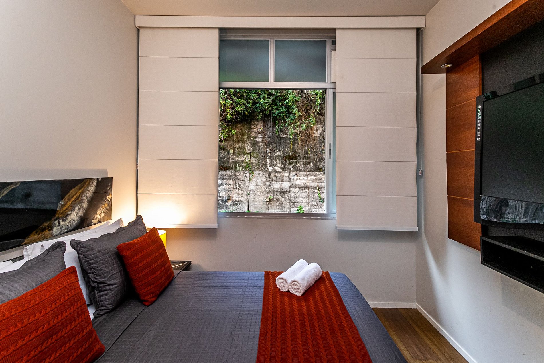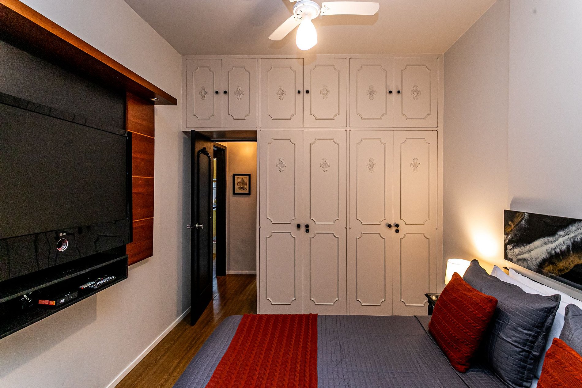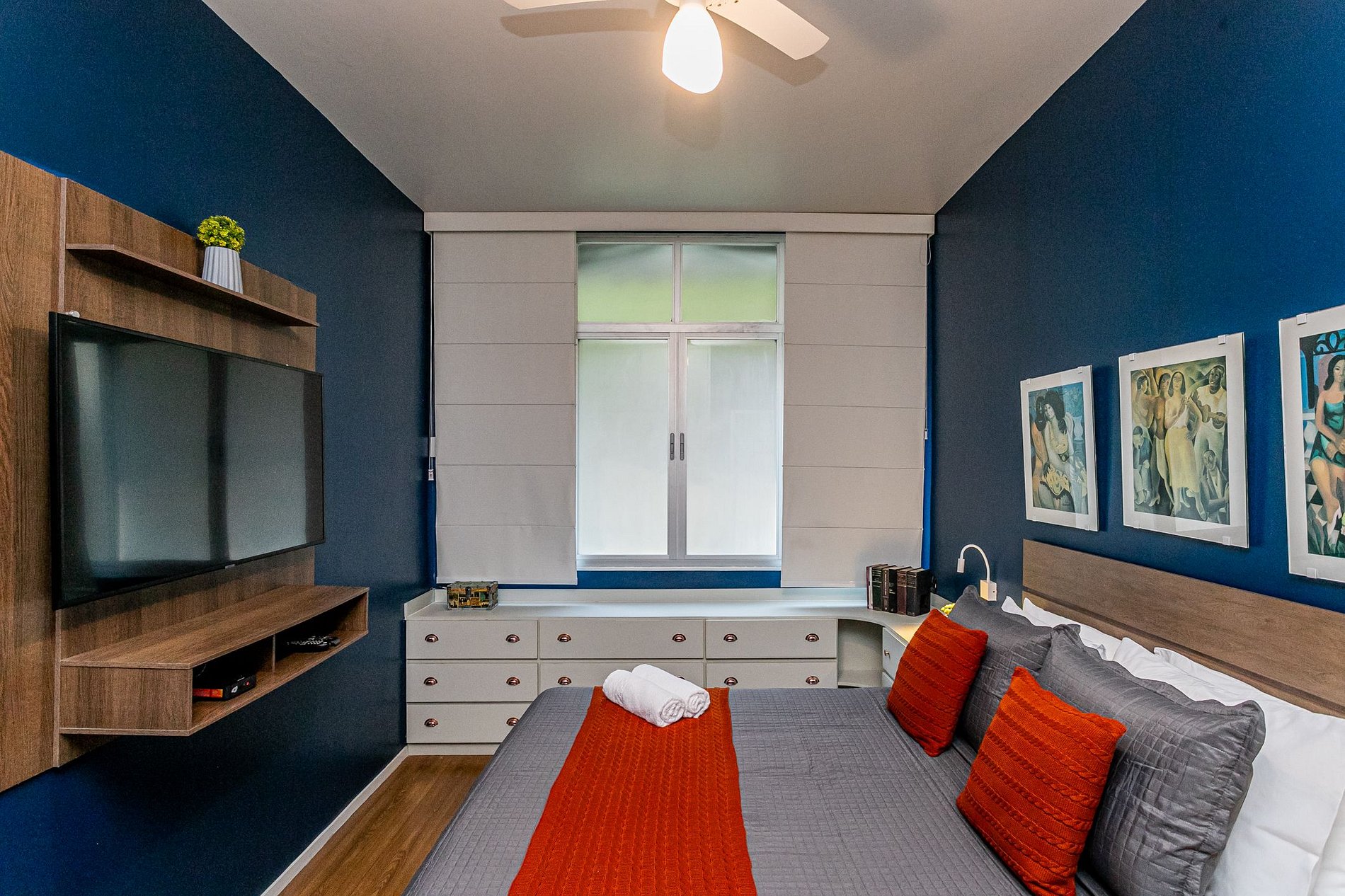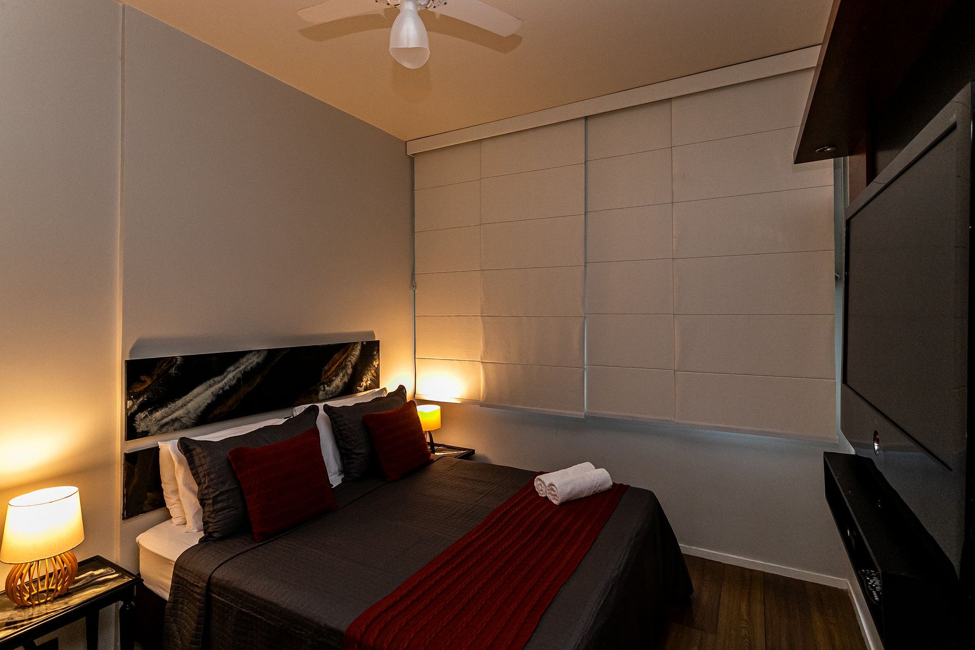 - A suíte está equipada com ar-condicionado, cama Queen-Size, cortina Black-Out, armário Guarda-Roupa, SmartTv de 42" e workstation.