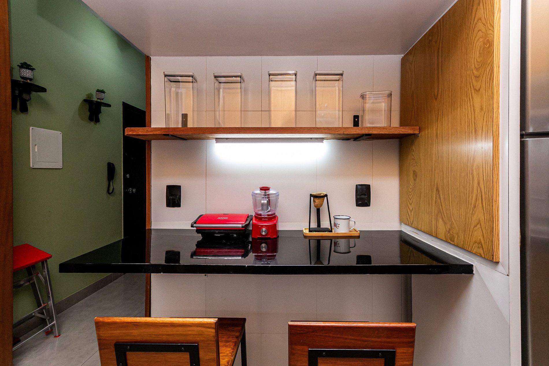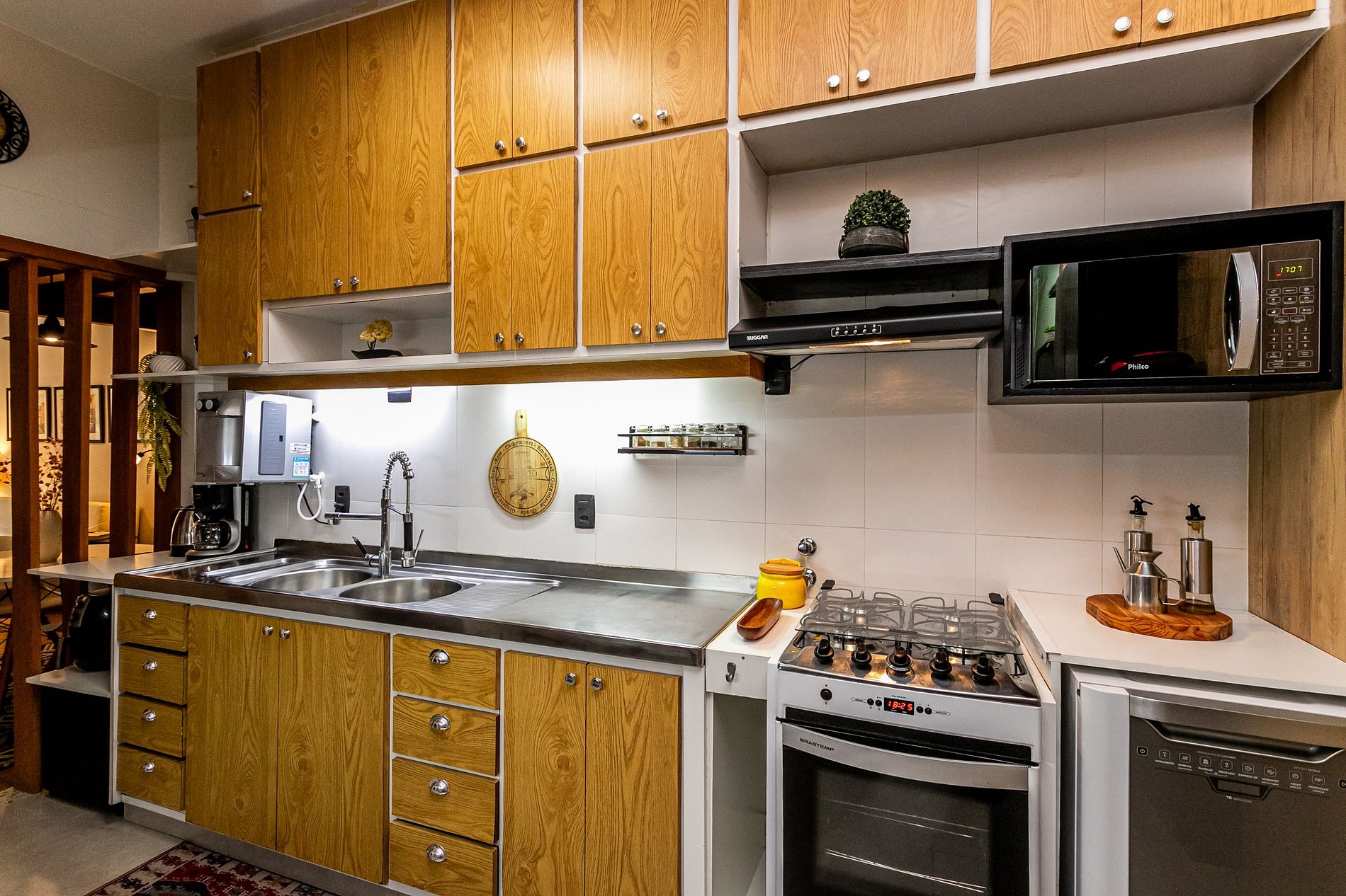 - A cozinha é completamente equipada com tudo necessário para você preparar as refeições do dia-a-dia; Geladeira, Fogão, Forno, Filtro de Água, Cafeteira elétrica e Lava-Louças. Além disso o espaço dispõe de pratos, copos, xícaras, talheres e demais utensílios de cozinha.