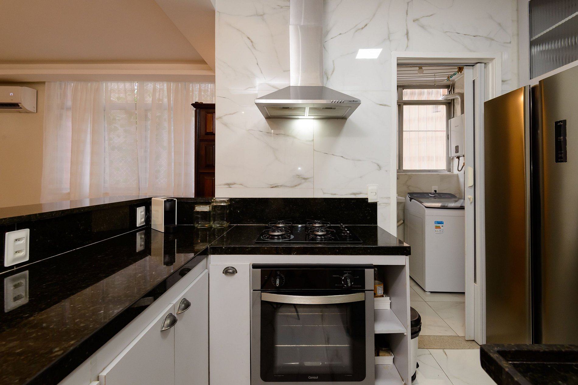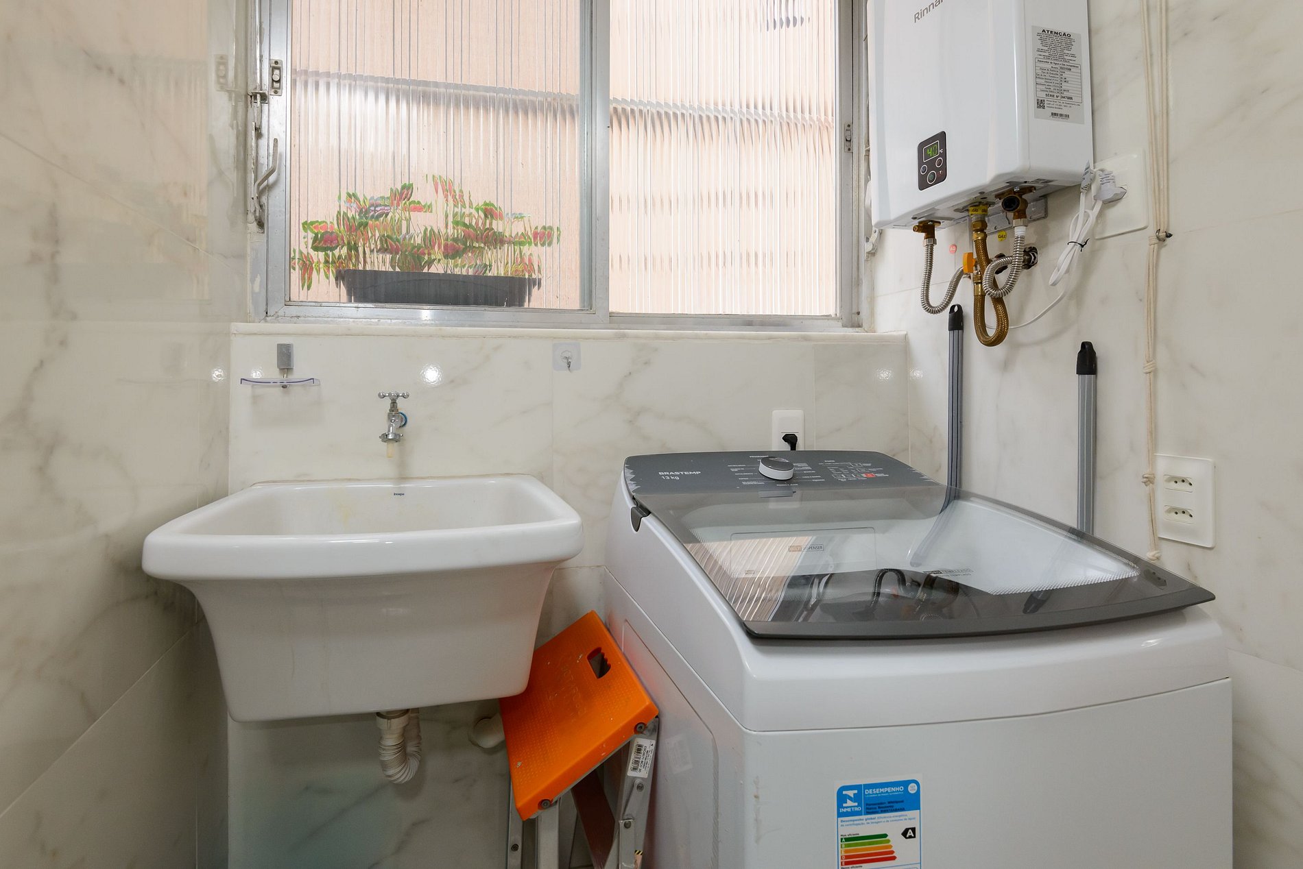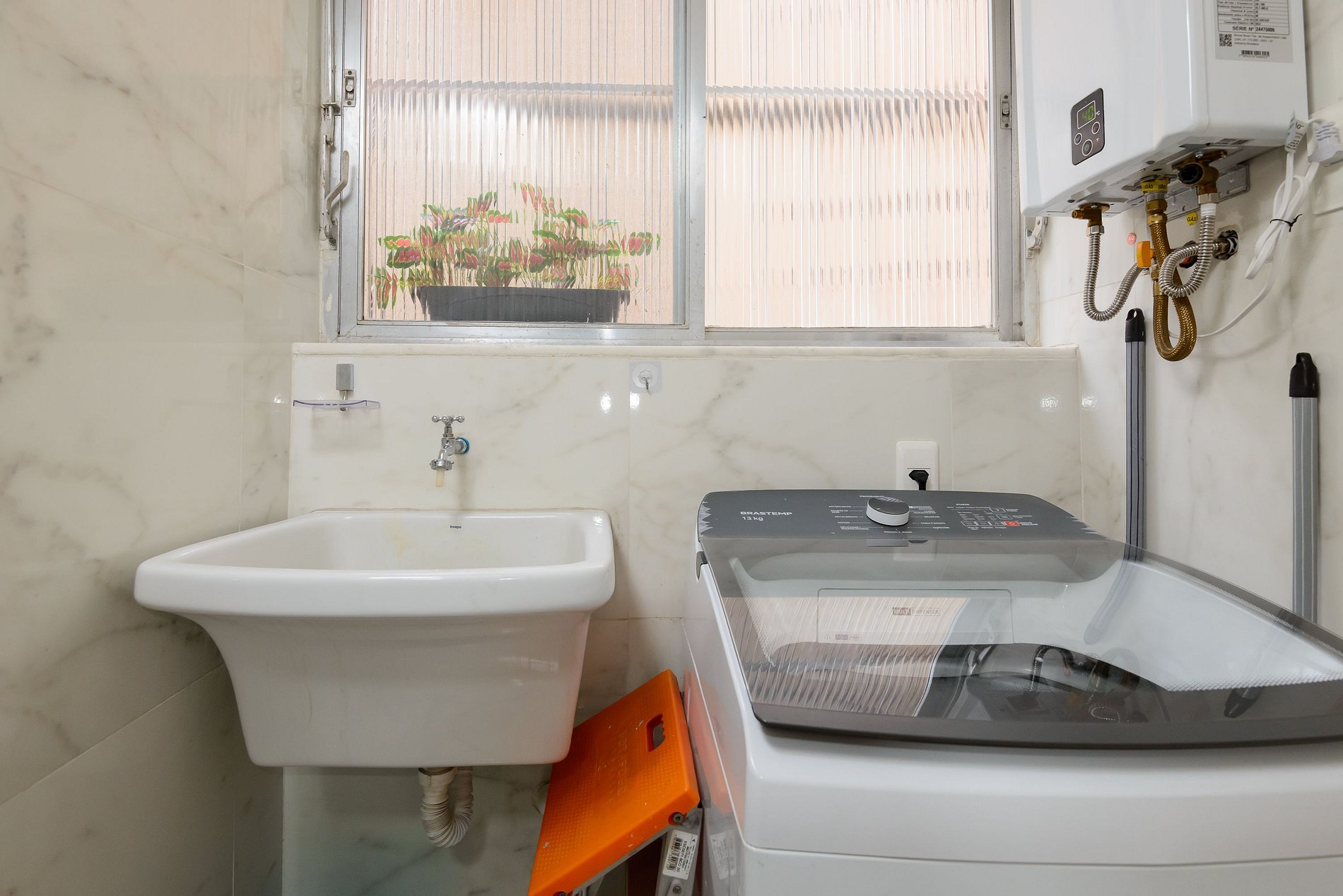 A área de serviço oferece ainda mais praticidade, contando com máquina de lavar, tanque e espaço funcional para pequenas tarefas do dia a dia.