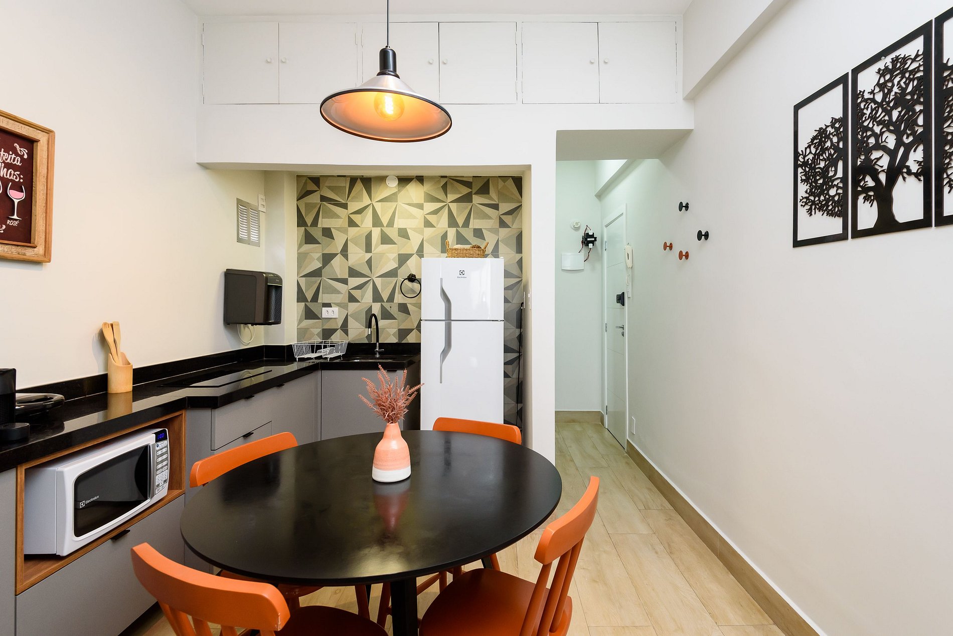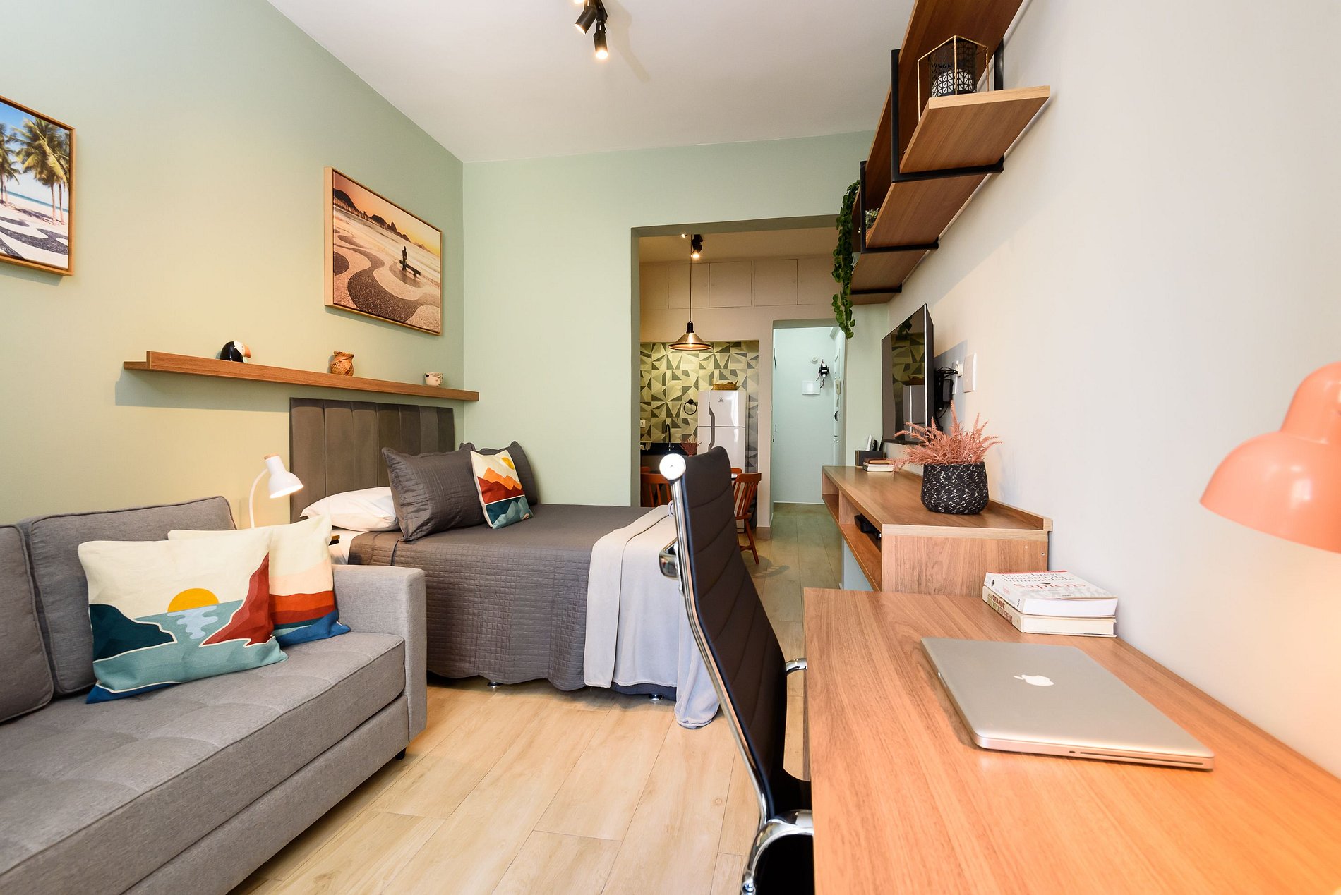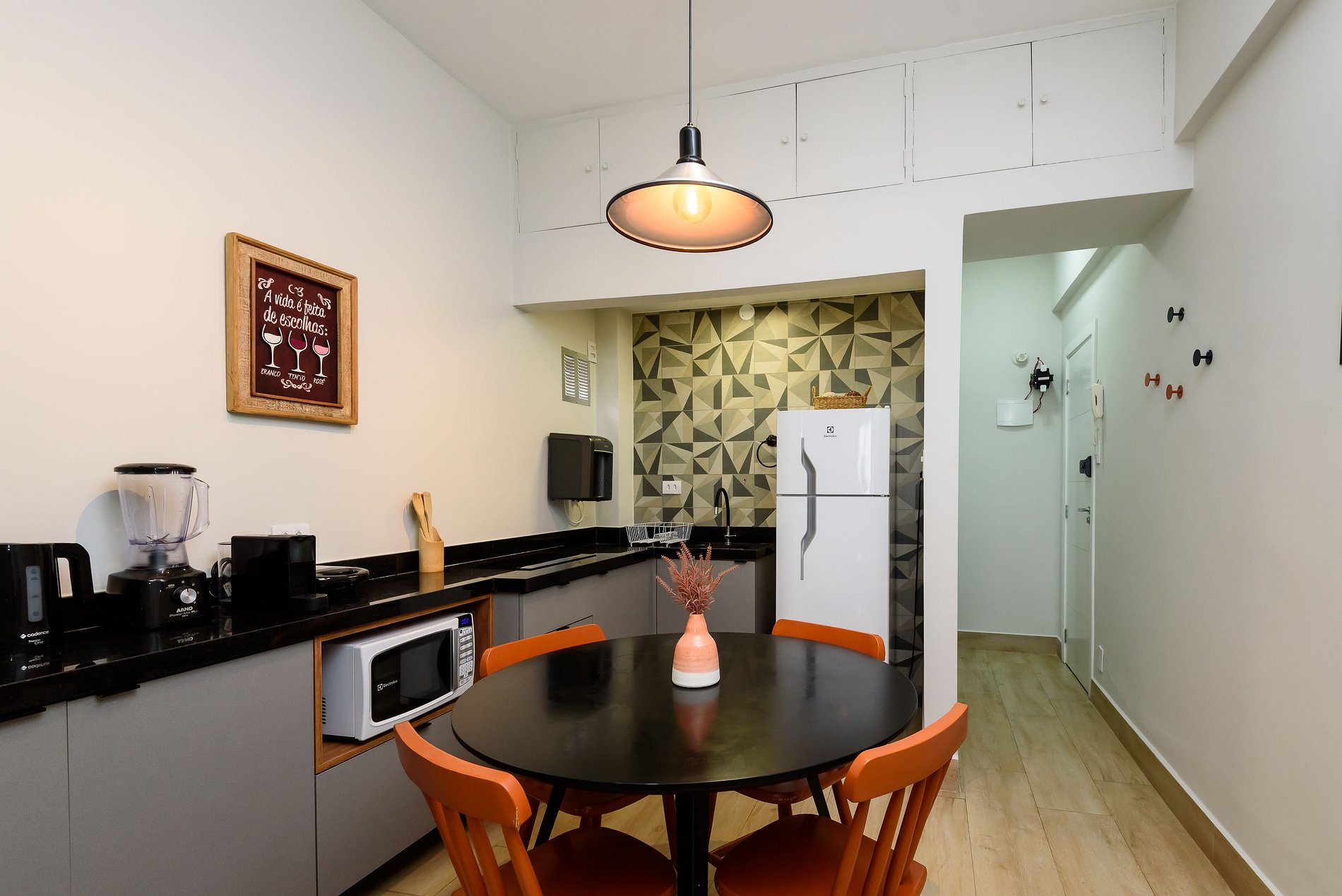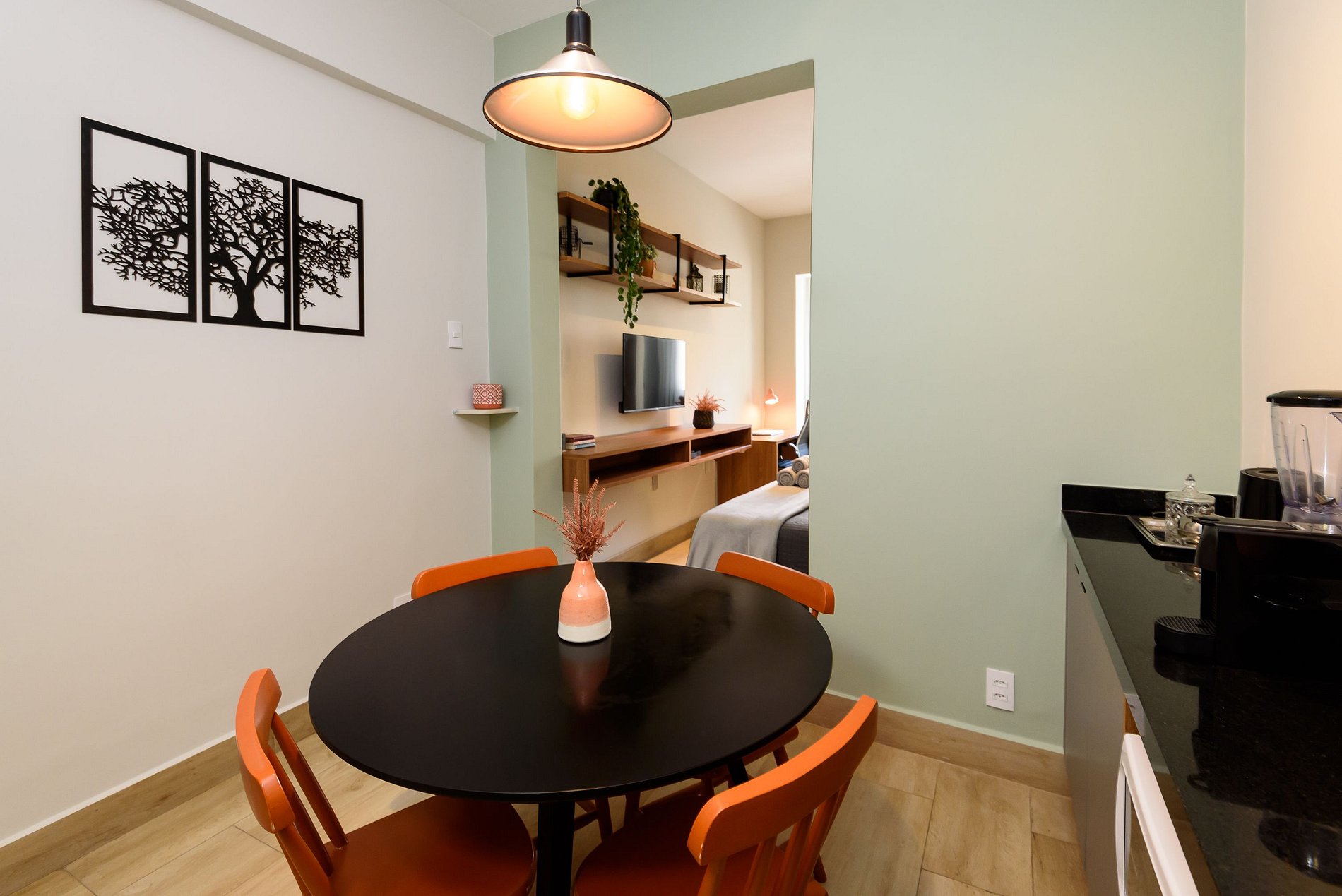 Estúdio dedicado à hospitalidade, equipado com todas as facilidades para uma estadia confortável e agradável. O quarto está equipado com uma cama casal, ar-condicionado split e estação de trabalho, SmartTV e sofá-cama. A cozinha está totalmente equipada com tudo que você precisa para se sentir em casa: micro-ondas, fogão elétrico de 2 bocas, geladeira, máquina de café Nespresso, liquidificador, pratos, panelas e talheres. O banheiro tem box com chuveiro elétrico e secador de cabelo.